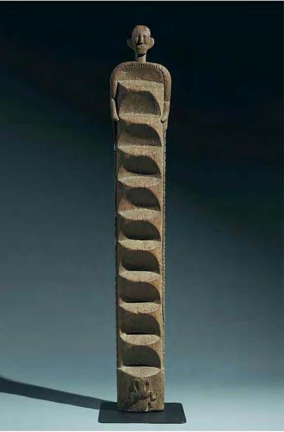 Unlike the more common and taller longhouse entry ladders, this rare example was kept in the interior of a noble family's residence and was used to gain access to the storage areas above the living quarters. Those using the ladder would step over the image of a “decapitated slave” or “ritual sacri ce” (meant to appease the spirits), shown carved in relief at the base, then climb up to the awaiting arms of a powerful ancestral gure, who is “holding” the ladder steady.