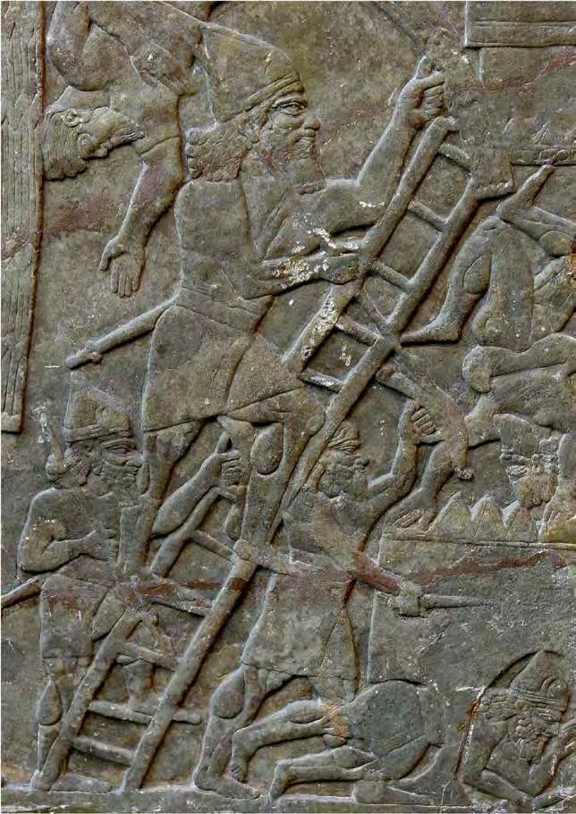 Alabaster bas-relief depicting an attack on a city by the Assyrian army. Neo-Assyrian Period, 865–860 BCE Detail of Panel 5 (bottom), Room B, the North-Palace Palace, Nimrud, modern-day Iraq. (The British Museum, London).