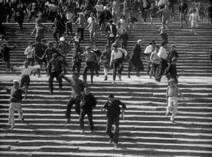 (1958) (V1, p. 176) and “Psycho” (1960). The director used stairs to manipulate the viewer’s reaction and create a rollercoaster e ect. As Hitchcock’s heroes go down and up stairs, their movement re ects the waxing and waning of suspense. Probably the best-known staircase scene in the history of cinema is the Odessa Steps sequence in Sergei Eisenstein’s “Battleship Potemkin”. Cameraman Eduard Tisse recounted that he used sharp light and shadow to create drama in the frame. The lm crew found more and more expressive opportunities as lming progressed on each of the 120 steps. The abstract idea of oppression is embodied in the drama of steps turned symbol of national pain. The scene is a tragic plea for revolutionary action, a metaphor for the confrontation between good and evil.