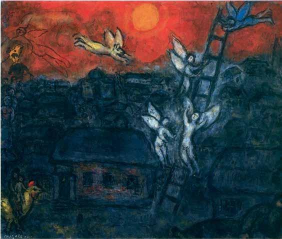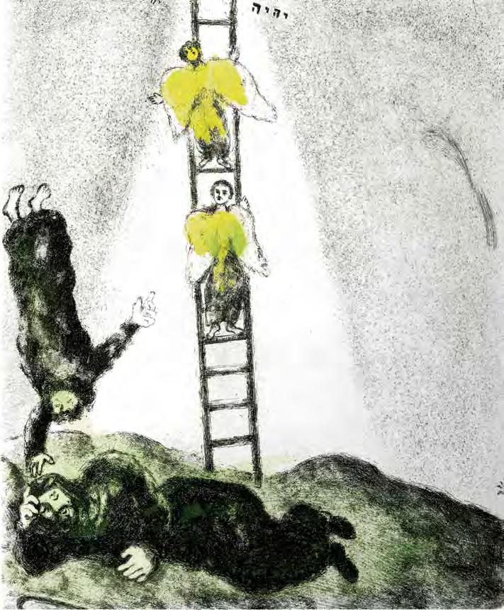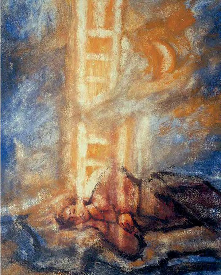 In Tsivin’s work the ladder Jacob sleeps under is of triangular form, suggesting a stepladder or a tent (V1 : 80, 81); perhaps the shelter it provides indicates God’s protectiveness towards man. Or perhaps the tent, omnipresent in nomadic cultures like that of the Prophets, suggests the inevitability of the spiritual path that each of us must travel to reach our heights.