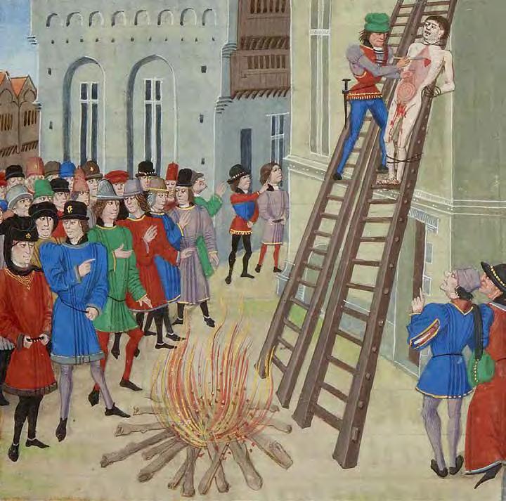 5 (с. 118). Illustration to Froissart of Louis of Gruuthuse, Execution of Hugh the Younger Despenser, XV century Ilustration of the execution of Hugh the Younger Despenser, from a manuscript of Froissart (Bibliotheque Nationale MS Fr. 2643, folio 11r) To be hanged, drawn and quartered was from 1351 a statutory penalty in England for men convicted of high treason, although the ritual was rst recorded during the reign of King Henry III (1216–1272). Convicts were fastened to a hurdle, or wooden panel, and drawn by horse to the place of execution, where they were hanged (almost to the point of death), emasculated, disembowelled, beheaded, and quartered (chopped into four pieces). Their remains were often displayed in prominent places across the country, such as London Bridge. For reasons of public decency, women convicted of high treason were instead burned at the stake.