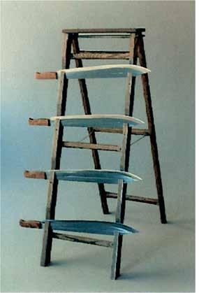 The Cuban artist Kcho (Alexis Machado) expresses this ambivalence in his 1990 installation, “The worst of all traps” (V2, p. 207). His ladder’s frail wooden frame suggests that it would make easy prey for enemies, but the rungs are made from machete blades — symbols of the Cuban war of independence. The artist’s use of palm branches — the national tree of Cuba, strengthens the already obvious allegory and ensured that the work attracted broad attention in Cuba. Nevertheless, Kcho asserts that the materials do not dominate the installation, but rather help the viewer find meaning in their very physical essence.