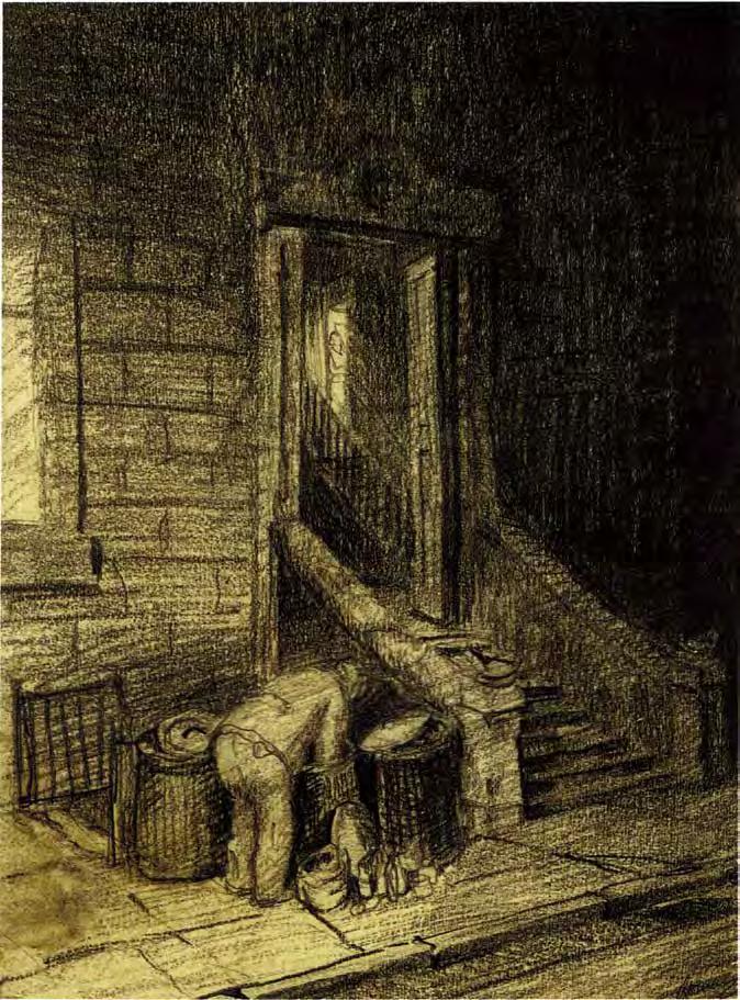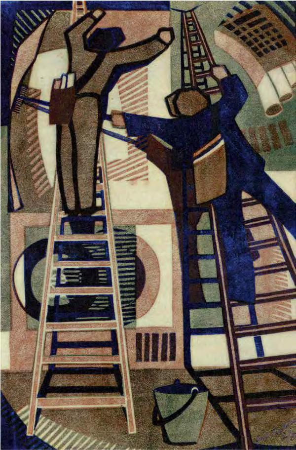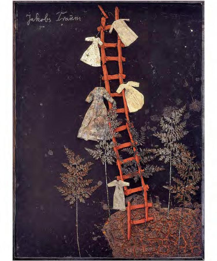 Red and white tones predominate in Chaim Soutine’s paintings, notably in his “Red Staircase at Cagnes” (Fig. ) — a profoundly tragic image that re ects the artist’s dramatic life and its constant psychological stress. This landscape from the artist’s early period is an attempt to comprehend the meaning of color. Soutine was very interested in red as the color of both life and death. His red staircase, reminiscent of the backbone of the split carcasses so often depicted by the artist, runs along a crooked street, conveying the niteness of the esh and the “ uidity” of being. Here once again we nd the heavenly staircase, uniting the carnal and the sublime, the inaccessible but possible. Leningrad nonconformist Gennady Ustyugov’s 1993 painting ”Whither leads the ladder?” (V1 : 159) can be seen as a reference to Russian Orthodox Marian iconography. Ustyugov places the ladder, in dialogue with a female gure, against the background of an unreal landscape. The bent position of her translucent body reminds the viewer of the angels in Andrei Rublev’s “Trinity” icon, and her head is tilted toward a ladder, suggesting it is a way to the mountaintop. The female gure is imbued with the mood of estrangement from the earthly and the readiness to make a journey; the presence of a ladder as a transcendental sign gives hope for salvation, hope that the soul will gain strength and recover after su ering. The painting largely becomes a mirror of the internal state of the artist himself, who has de ned his primary question in the work’s title: does the ladder represent atonement or punishment?