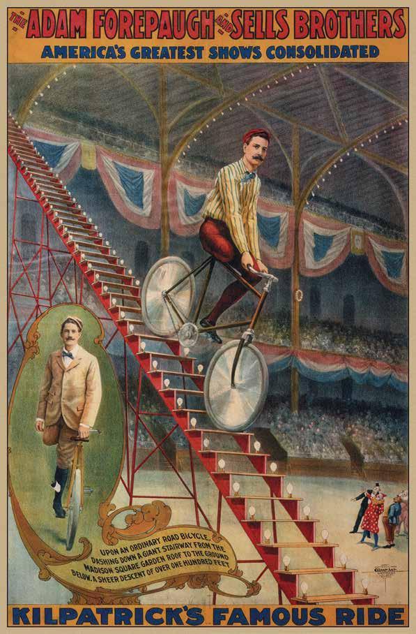11 (с. 192). Kilpatrick's Famous Ride, с. 1900, advertising poster Dashing down a giant ladder or staircase on a bicycle was a relatively common stunt. But it was more engrossing to watch when performed by the one-legged cyclist Kilpatrick, who became famous for refusing to be restricted by his handicap.