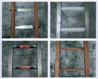 Thus, we can talk about the ambivalence of the image of stairs and ladders, now uplifting and sacred, now aggressive and destroying; they are often encumbered with elements contrary to their practical nature. Stairs or ladders, helpful tools that accompany a person on his path, can be transformed into obstacles blocking that path. The materials stairs or ladders are constructed from can evoke associations with physical pain, communicating an aggressive message and a danger sign.