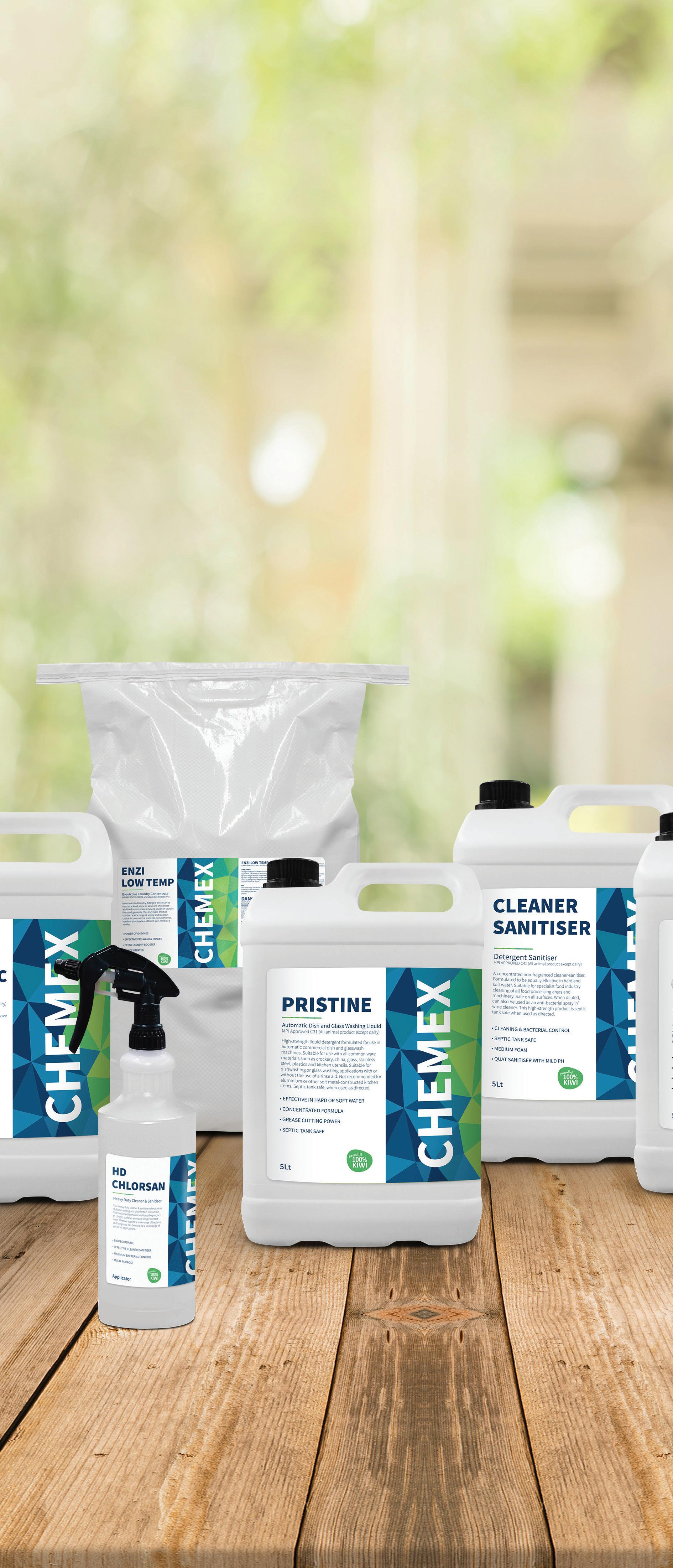 Chemex is a range of quality products for commercial cleaning, sanitising and disinfecting. The formulations are specially designed for housekeeping, food service, food manufacturing, hand care, laundry and a range of specialist applications. Many products are MPI approved, so this is more than just a product range, it is a total solution developed and manufactured in New Zealand for local requirements.