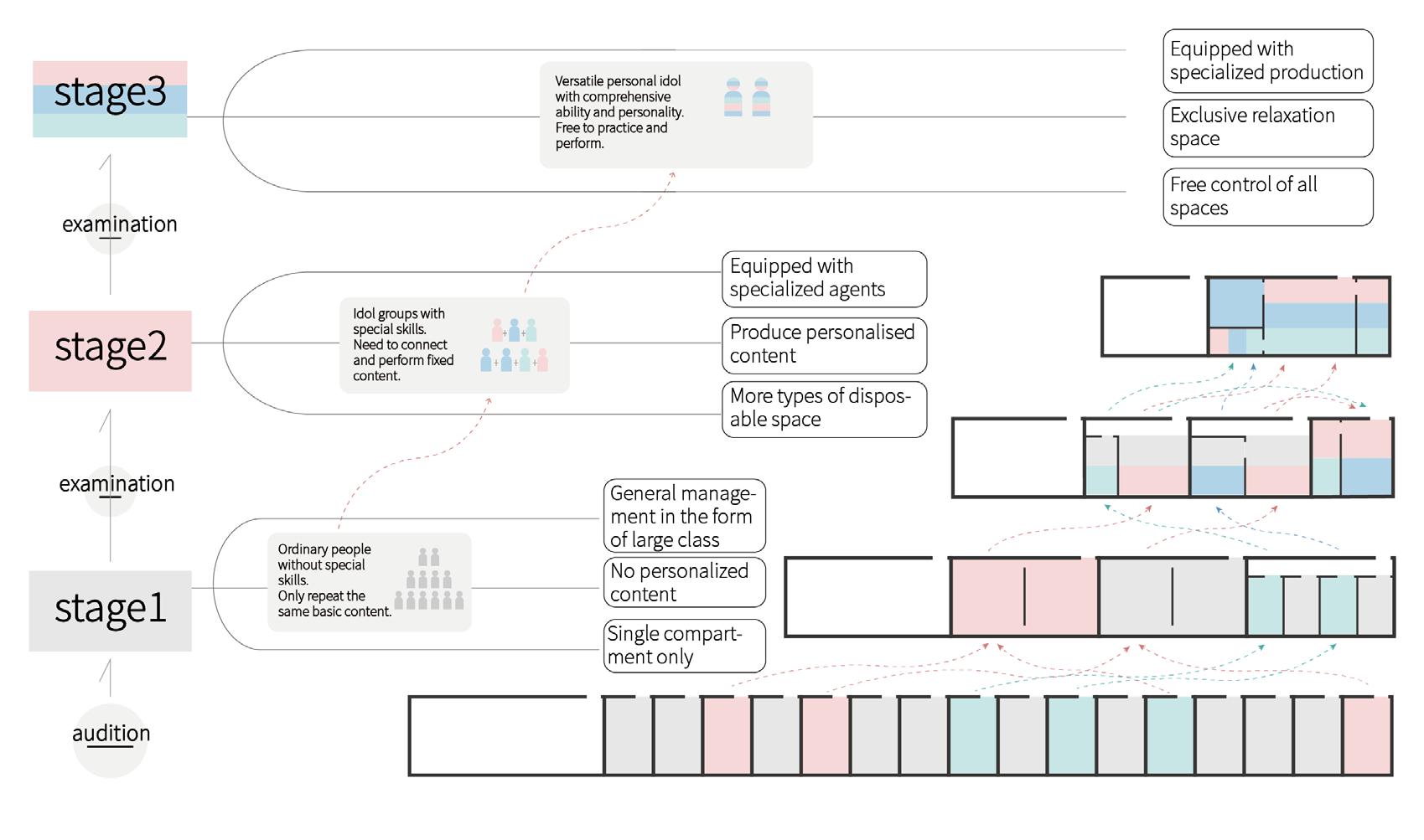 At first, one person could only have an enclosed small-size room, but after a successful upgrade, he can enjoy a whole floor. Furthermore, the progressively transparent facade suggests an increased exposure and opportunity for performers to showcase their talents.