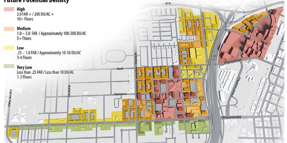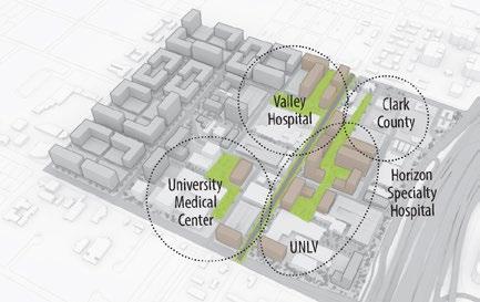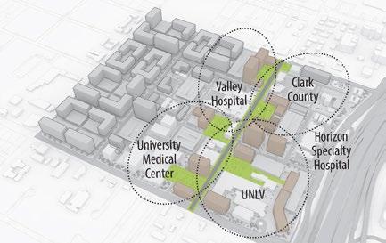 By 2030, the Las Vegas Medical District (LVMD) will be the clinic, research, wellness, and education center of Southern Nevada and the premier academic medical district in southwestern United States. The master plan encourages a collaborative approach to development of 640 acres directly adjacent to downtown Las Vegas. The project team used City Engine as a procedural physical planning tool to optimize the framework that accommodates profitable development aligned with project goals, initiates a vibrant mixeduse lifestyle, and emphasizes multi-modal, green streetscape and new boulevard linkages woven among the fabric of City of Las Vegas.