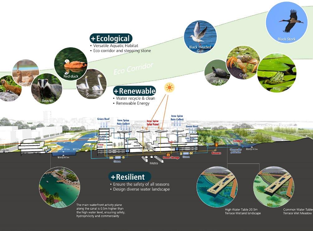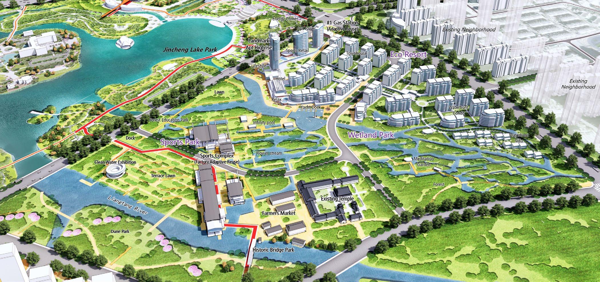 According to local topography, hydrology and developed land, a fourlevel green space system will be constructed to restore the major native species habitats such as mountains and water body, as well as the corridors among them, in order to improve the health and integrity of river ecosystem in project site