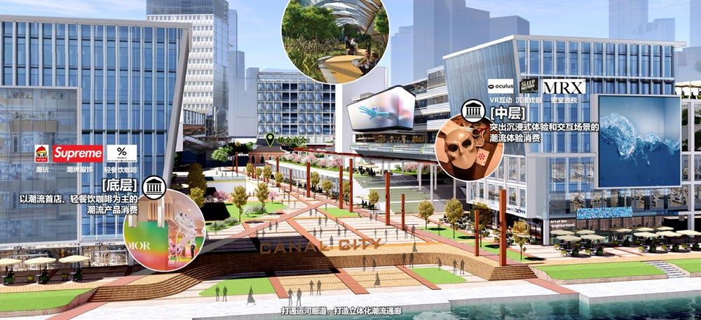 Open up to canal interface. Form an open space corridor. Inject trendy commercial elements and form a composite trendy block that integrates consumption, office, and community.