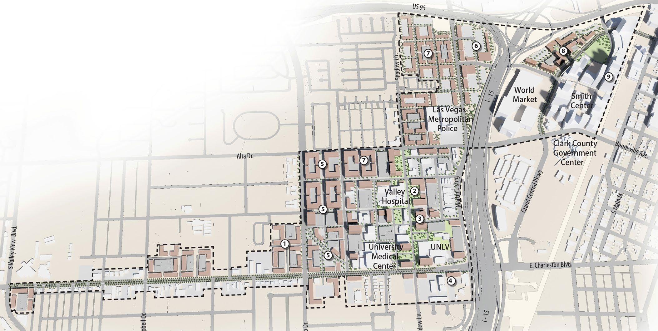 Built on a framework for ongoing change in downtown Las Vegas, the LVMD will capitalize on the potential development of prime real estate, providing opportunities for new academic, medical, research, clinical, and office development; creating an attractive destination to live, work, learn and play. Rooted in a consensus-oriented process, this plan represents optimal urban design configurations for development of the LVMD in the long-term.