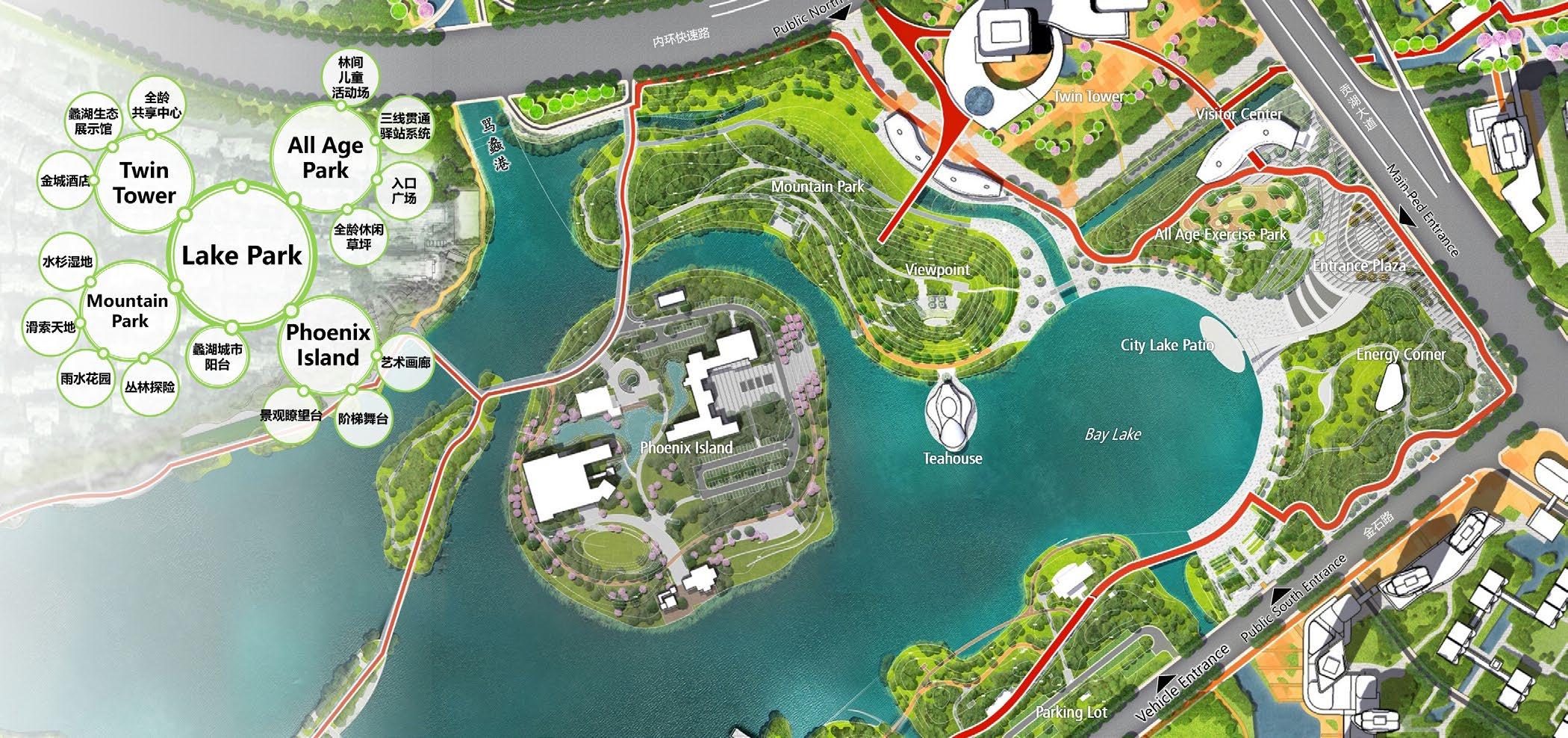 Benefited from adjacent Bay Lake Park as the most valuable natural resource, the virgin land of 1.3 sqkm has been planned as convalesce and healthcare center with precedent hospital under construction. This project prioritizes ecological and enjoyable revitalization of the three rivers draining into lake, resulting into three main development and landscape urbanism areas. The nature based urban design solution will promote this place to be the new center of healthcare and medicine R&D industry; the new relax destination offering diverse living, shopping and entertaining programs; and the new unique habitat livable for new residents.