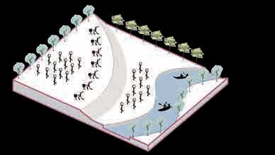 simulation The terrain is rugged and the water lines are messy. The pigeonhouses are in a messy distribution. Planting along the water catchment line. Catchment line Cut out stepped terrain according to contour lines to guide water flow and reduce flow rate. No vegetation, fast water flow. Water collection tank Rainwater collecting Purify Water Purification System Plants guide water flow and slow it down.The planting density increases, the water flow rate is slower, and the water penetrates into the soil. According to the terrain, available pigeonhouses are integrated to form a water catchment line to reduce the area washed away by rainfall. When plants reach maturity, they form a water cycle and reuse resources. Over time, the flow of rainwater will slow down, the flushing area will decrease, and soil erosion will decrease. Irrigation Water supply