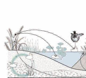 revetment type + Separate space for people & birds Agriculture Growing wild rice in the field provides a natural food source for birds and fish, while bird and fish feces provide fertilizer for the growth of wild rice, forming a selfsufficient food chain and reducing human intervention. Site Resources Fishery Separating and polluting water Pollution of soil and water Birds Fish Oryza rufipogon Griff Single watering mode Too much human activity + + + + + Human-bird space is too close Old water diversion facilities Brick building "Three networks" problem Hydrostatic system Fertilization Destroying ecosystem Wetland