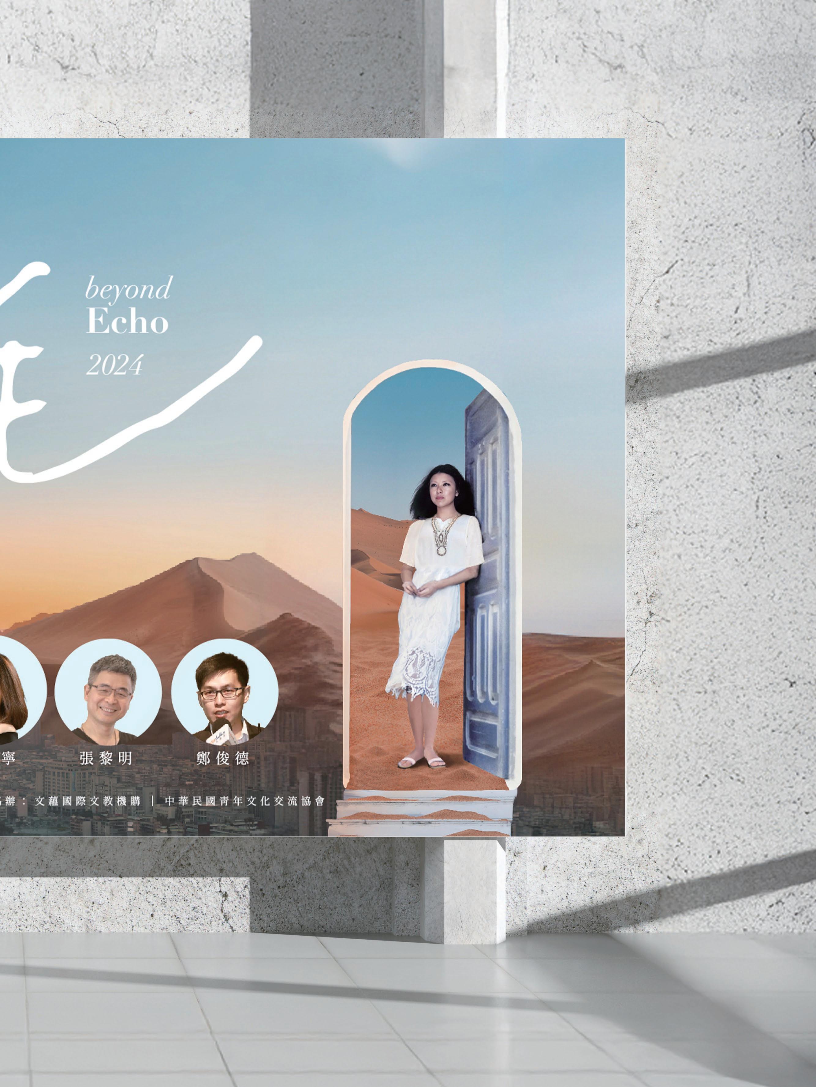 在視覺概念上,我運用影像合成的手法,將三毛生前的照片、台 灣101大樓的景觀與沙漠的壯麗景色相結合,象徵著穿越時空的 交流與連結。作品中,三毛從一扇門中走出,門後是廣袤的沙漠, 而台北的景色中也隱含著沙漠的元素,意在強調她作為第一位將 沙漠文學引入台灣的作家的獨特地位。