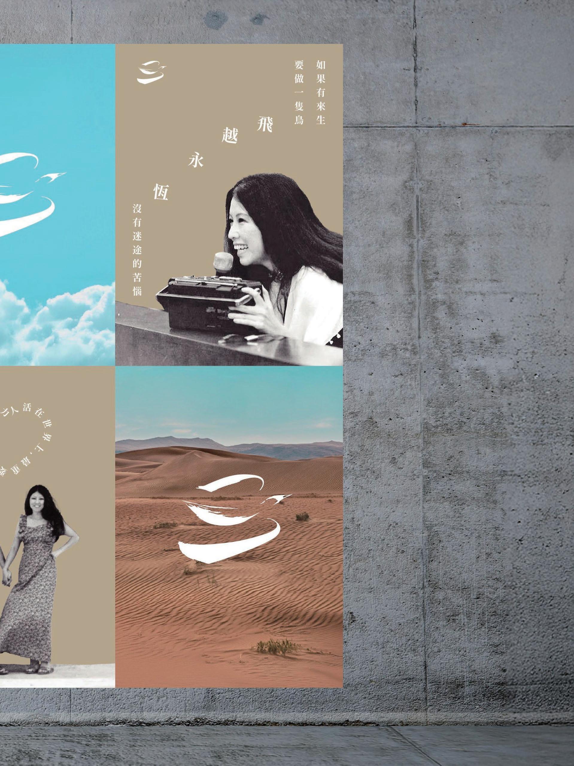 三毛曾說:「如果還有來生,要做一隻鳥,飛越永 恆。」這句話激發了我們的創意,我們計劃將「三」 字與鳥的形象結合,運用天空元素,展現自由的意 象,使她的精神更接近現代年輕人。