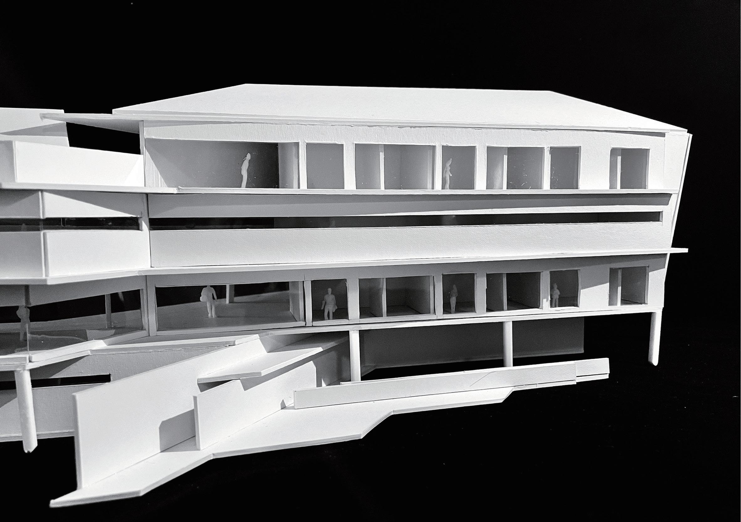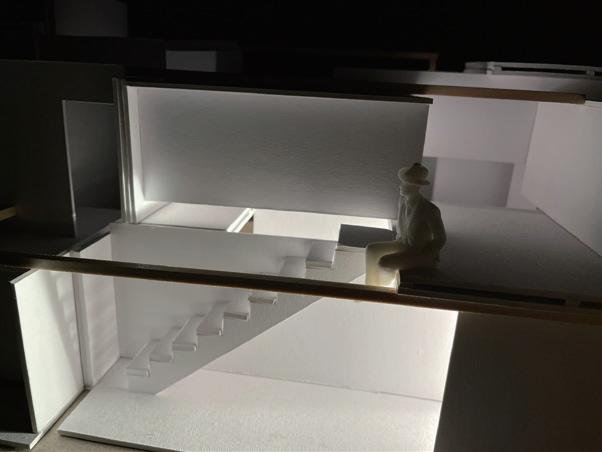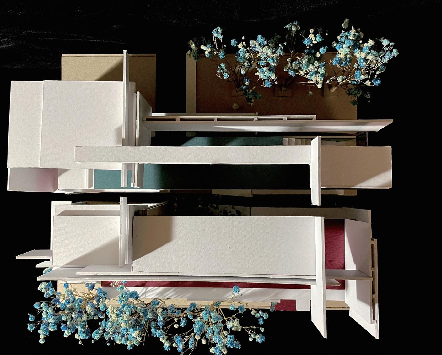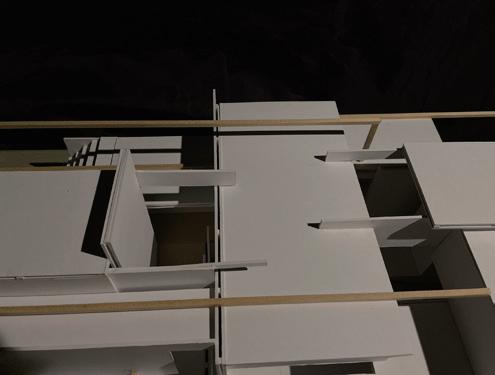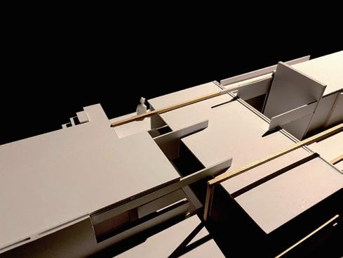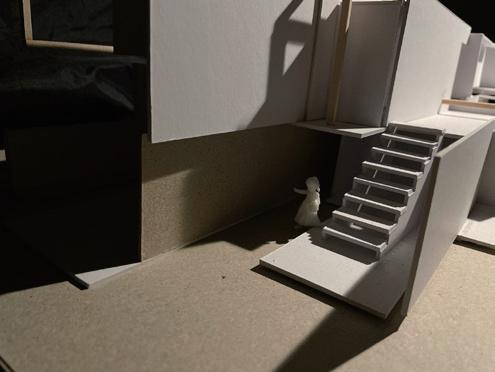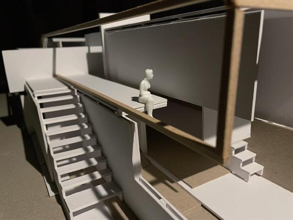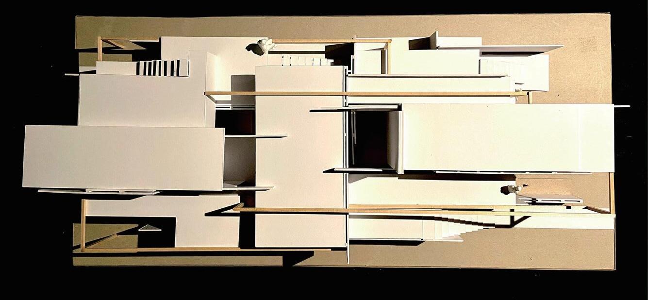利用量體錯位間造成的高低差,模擬使用者如爬山的居住日常,提供給未來即將 需要無障礙功能的年長長輩及創造運動機能,拉長空間與空間的距離,搭配窗外的綠 化,達業主之身心療癒功能。