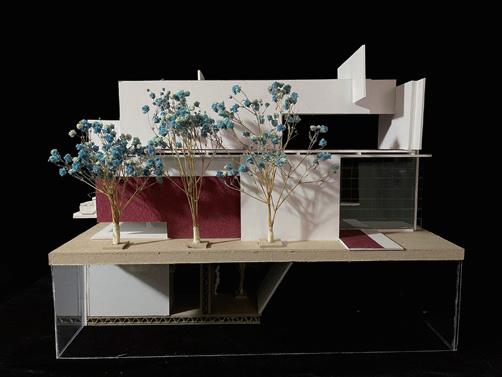 二樓樓板退縮使一樓具有天井做為室內庭園,配合 路徑規劃,使柔化機能差異的邊界,作為中間之過