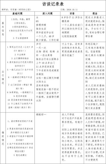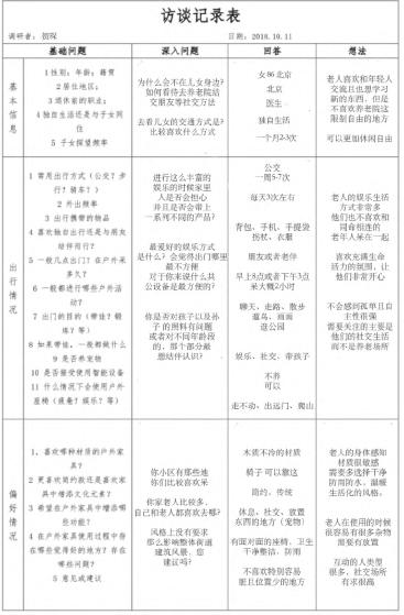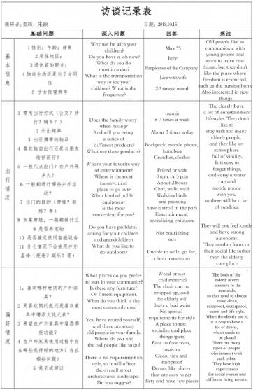 According to the basic information; condition of old people going outside and the preference, we design the structure of the research. And we also set some basic questions. Then we talk to the olds and try to ask them deepl y .Last, make a record of all the answers.