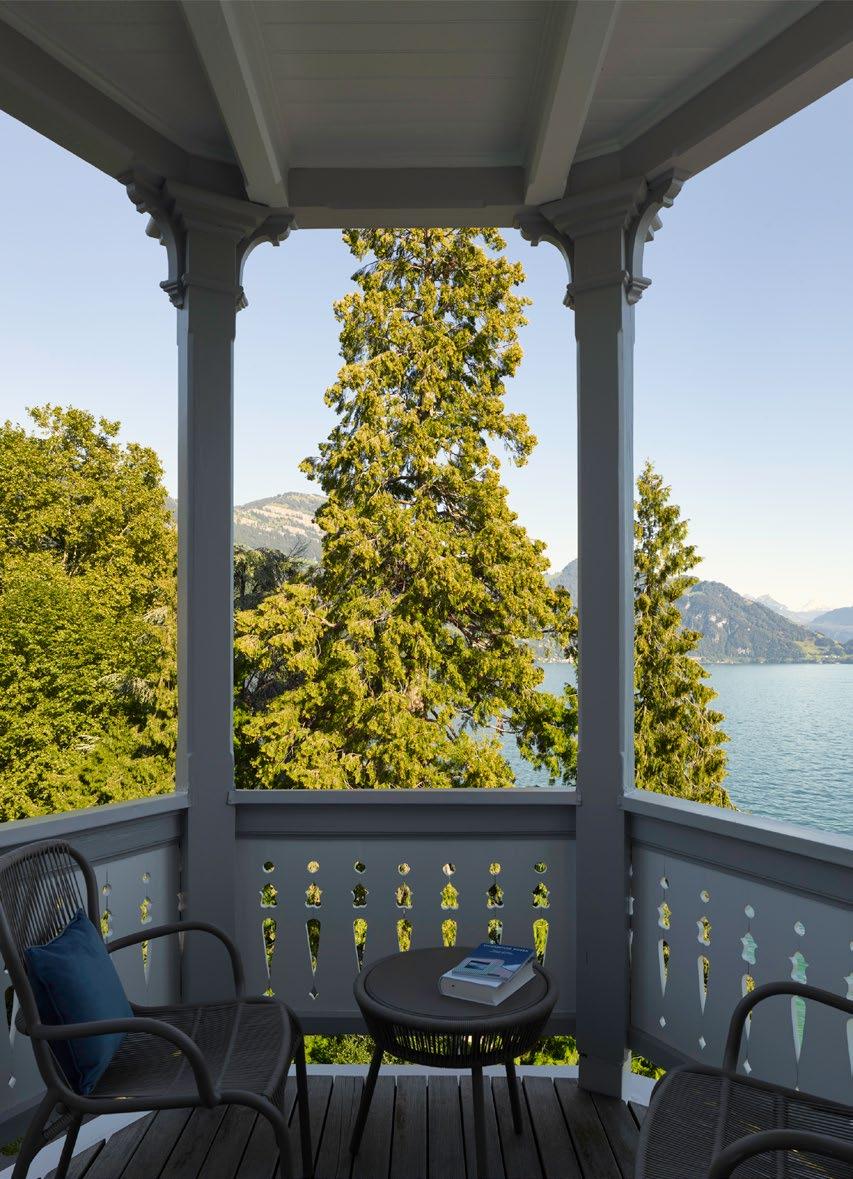 Anche l’ambiente sfarzoso, in stile contemporary chic, finemente arredato con morbidi divani, poltrone e ricercati oggetti di pregio invita a rilassarsi, fare conversazione o semplicemente apprezzare il bello della vita mentre si ammira il design eclettico degli interni o la vista stupenda e mutevole che offre il lago dei Quattro Cantoni.