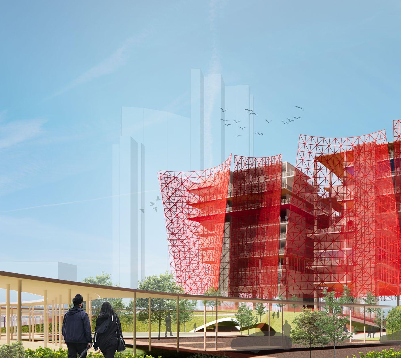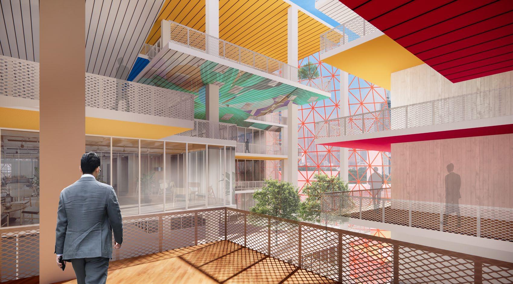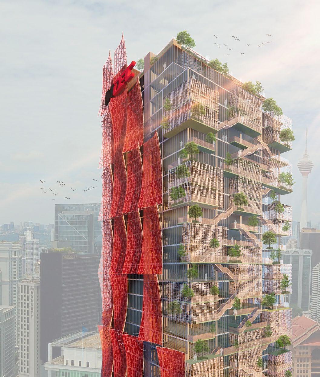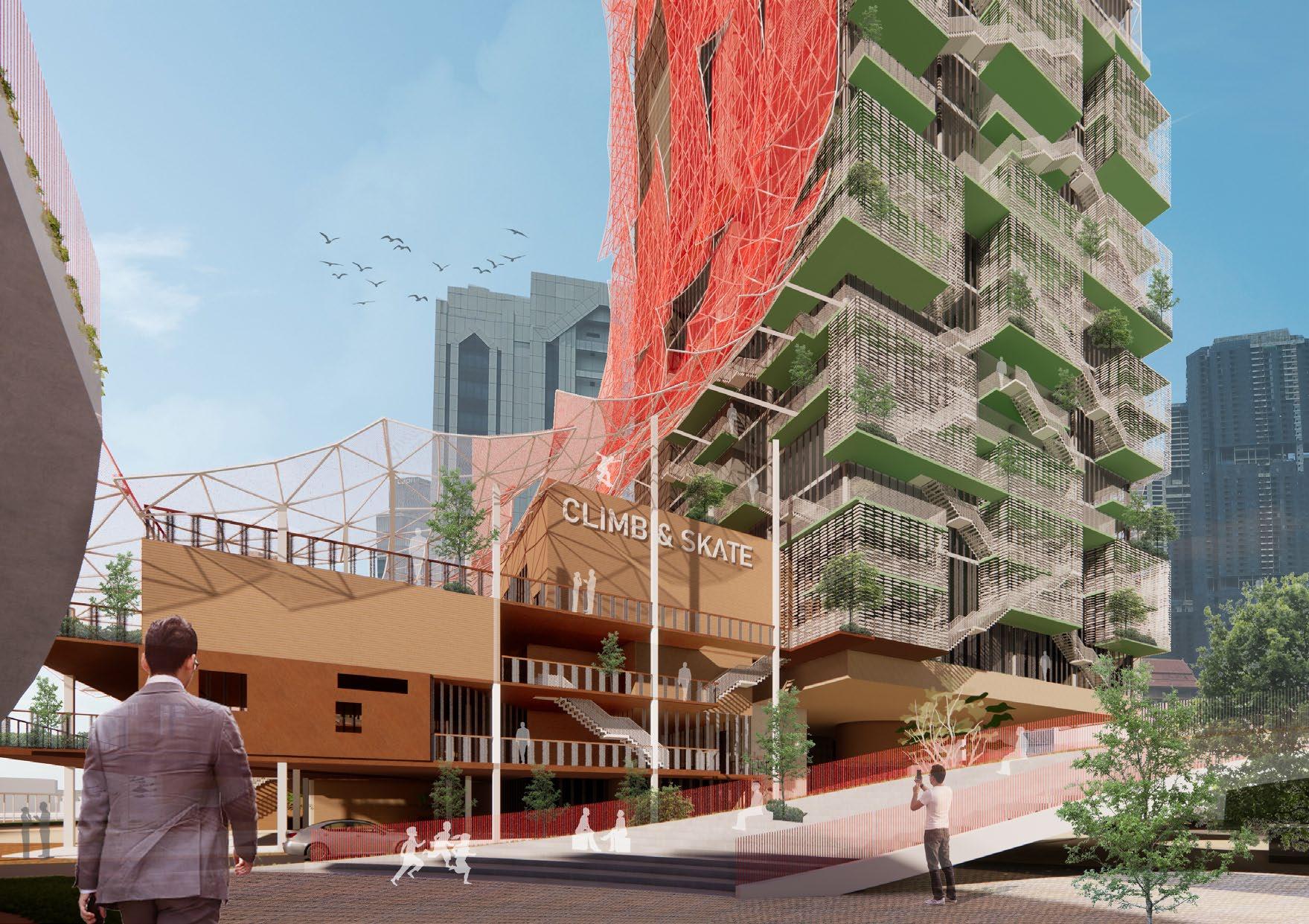 Rethinking office towers, the project acts as a catalyst for urban well being through the implementation of movement. Interior spaces are layered with capsule balconies, interweaving to form captivating spaces just like a tapestry.