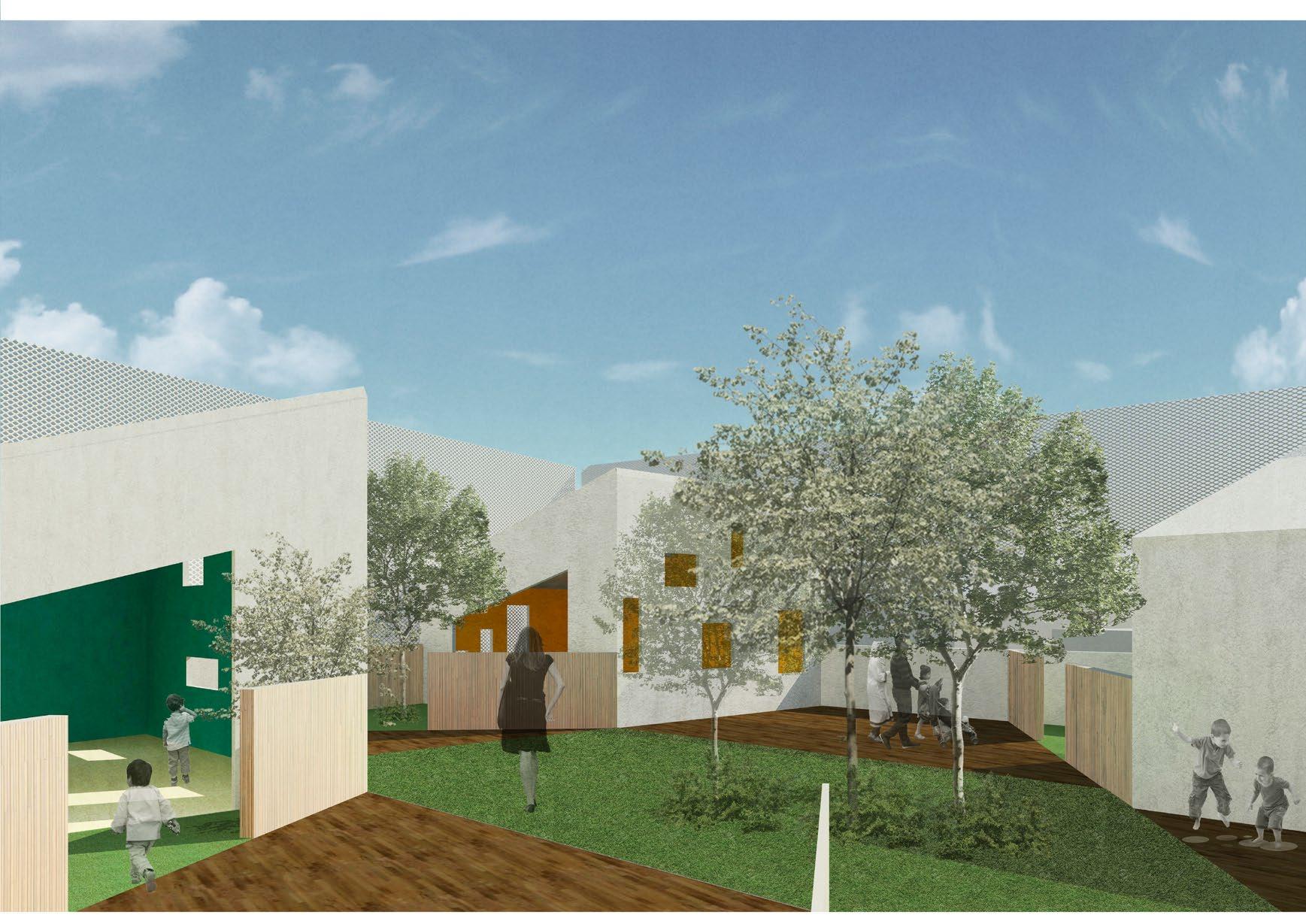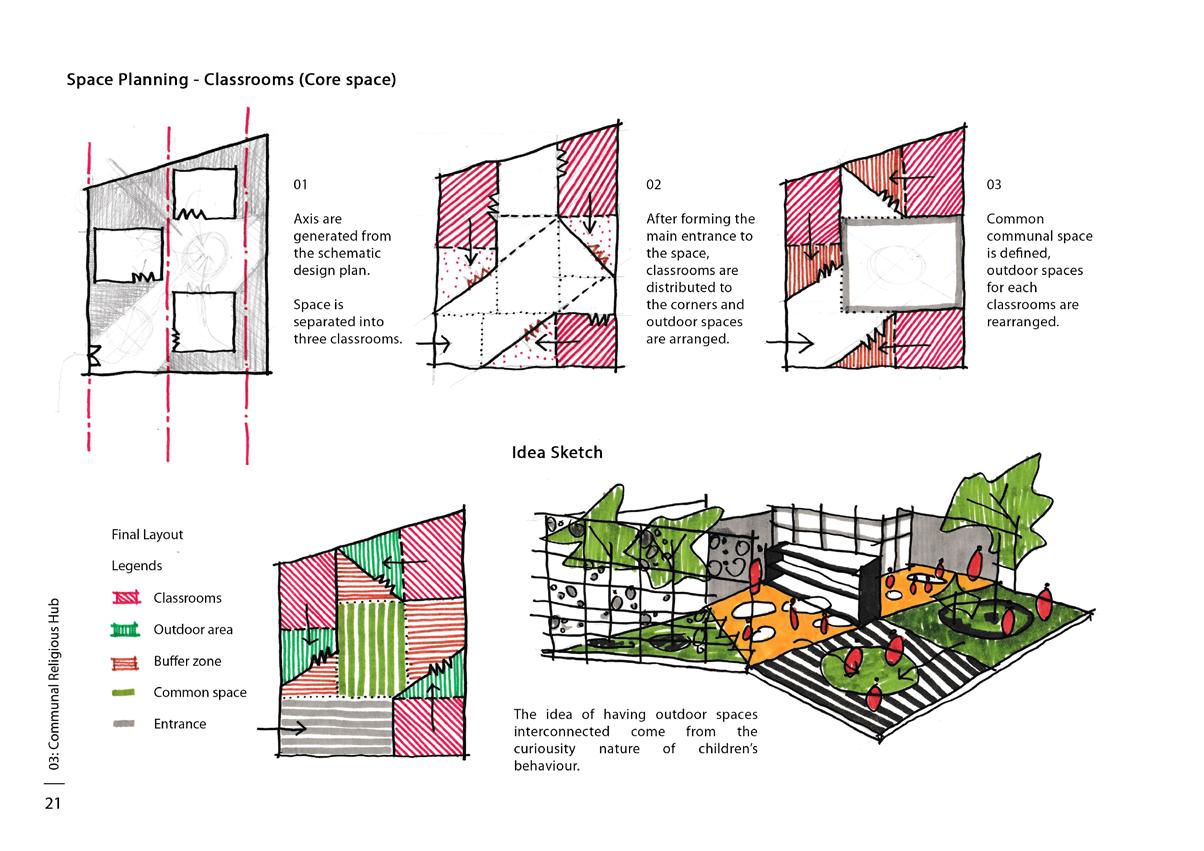 With education as the main programme to bridge communal & religion activities, rooftop classrooms are carefully curated with its very own outdoor green area. The idea of having ourdoor spaces interconnected come from the curiousity nature of children’s behaviour.