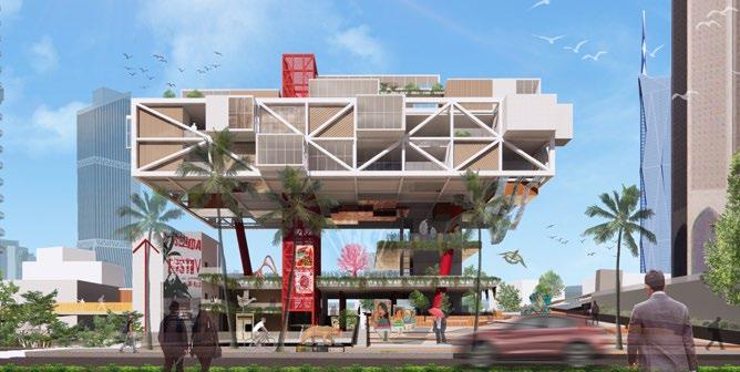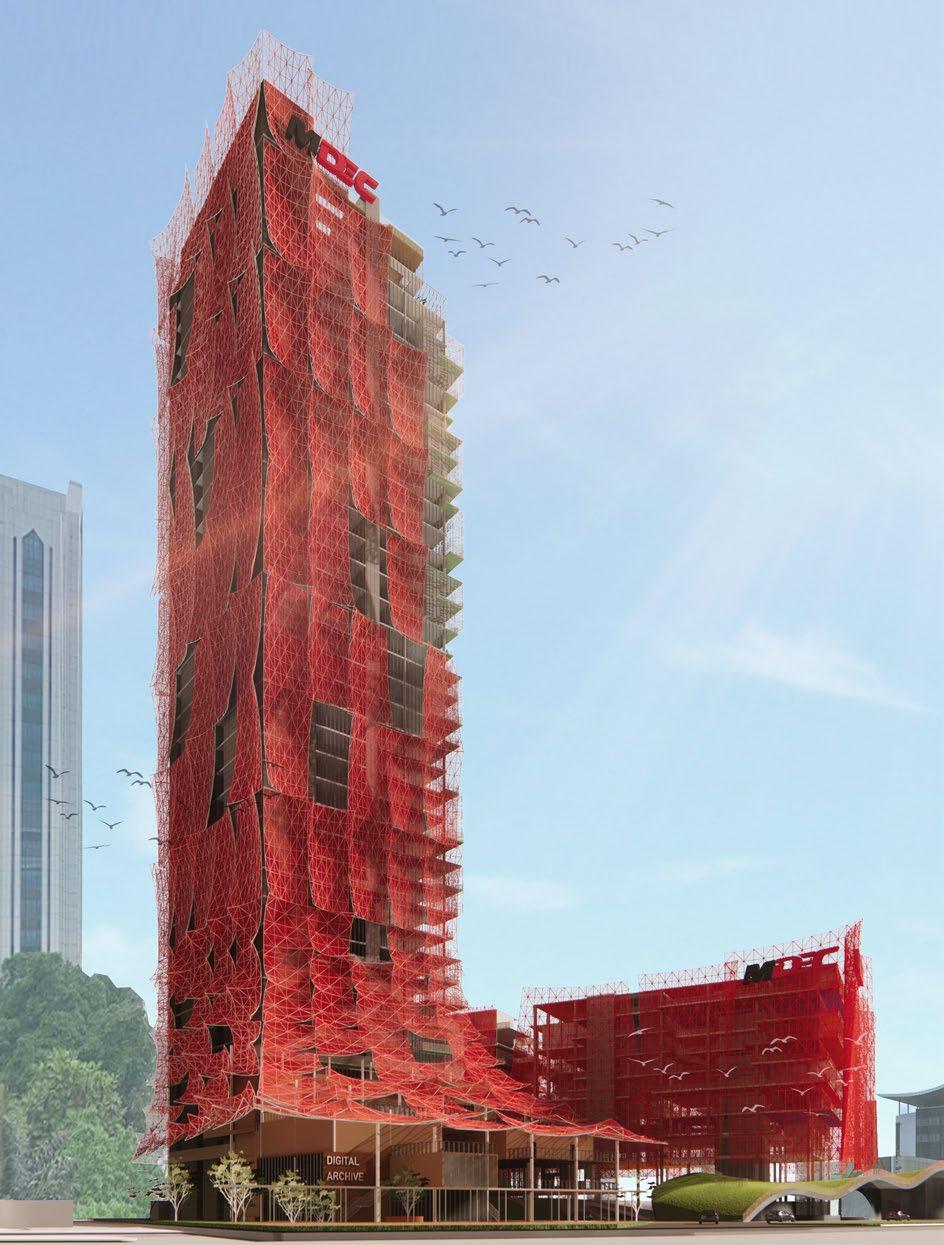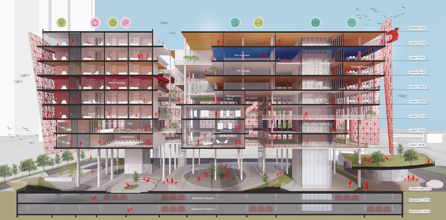 A Social/Digital platform - inspired by the form of communication in the digital realm. The design is to act as a multimedia vessel, to be seen and noticed like a ‘post’ on a platform, it sits high above the land like a flying craft within the heart of Kuala Lumpur.