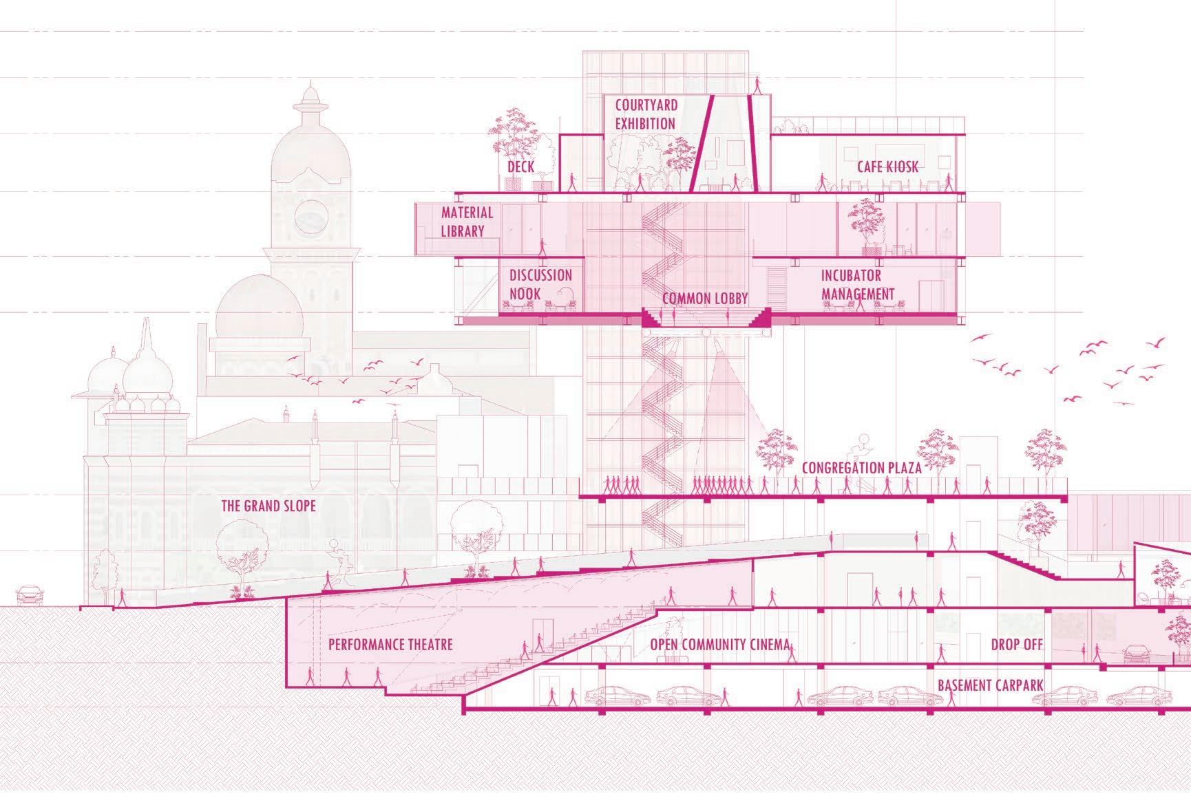 This thesis reviews the relationship between ‘Arts of Advocacy’ and ‘Advocacy for Arts’ by reimagining spaces of congregation in the urban fabric of Downtown Kuala Lumpur. It experiments with architectural solutions that can reshape activism through art as a prevailing societal expression. The project is viewed through the lens of architectural representation and semiotics, illustrating how architecture can symbolize and facilitate the continuous exchange of creative ideas and cultural expressions through transformable spaces.