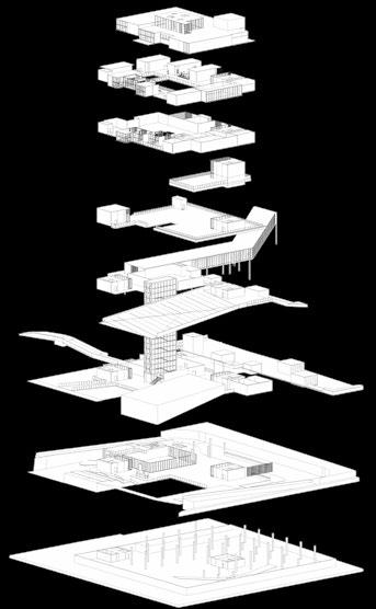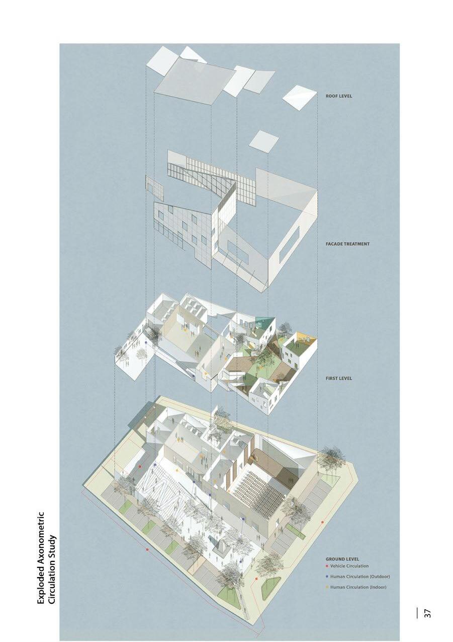 to create a journey experience, a linear axis is then proposed within the volumes of spaces. volumes are fragmented into series of small spaces well integrated with open spaces.