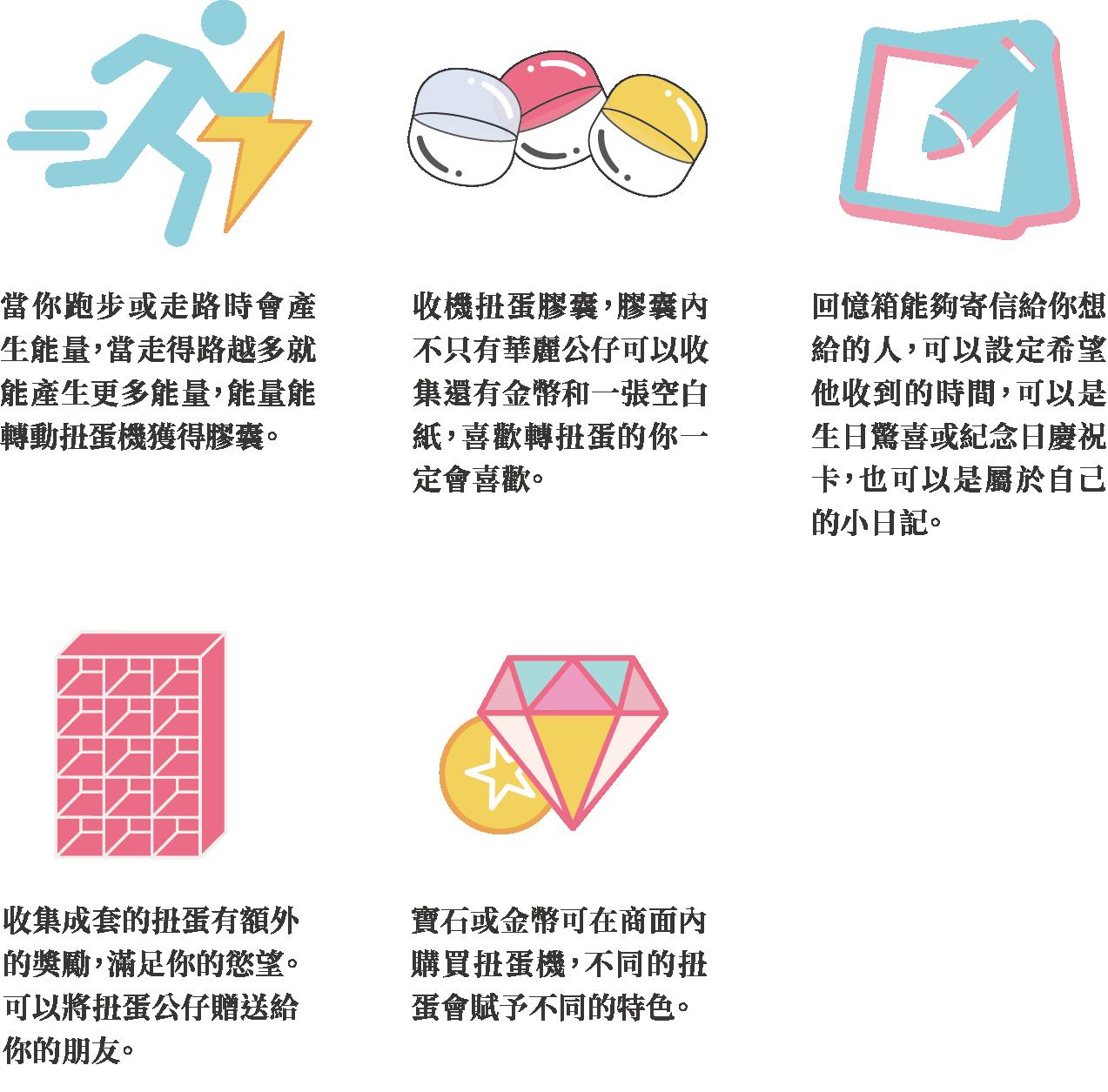 而我們又能記得幾分快樂幾分憂愁。「時光膠囊」不僅僅可以 每天紀錄你的日記更是你每天的健康守護者,並加入了 轉蛋增 加生活樂趣,一起來收集吧!