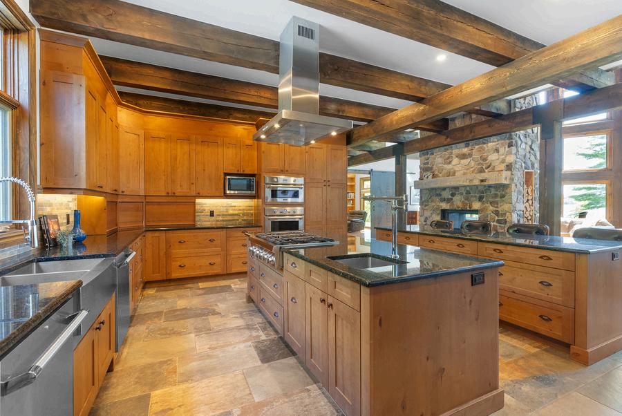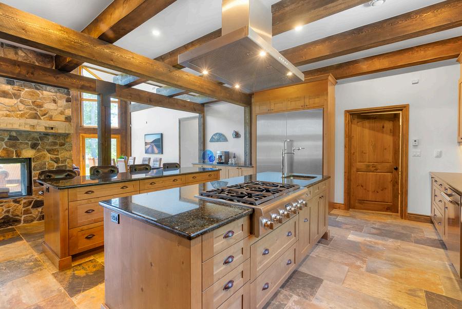 The great room boasts 27 ft ceilings with a stunning stone fireplace & soaring custom windows The chef’s kitchen includes two 9-ft islands, Thermador appliances, & Ubatuba granite from Brazil The main floor in addition to a library & office has 3 bedrooms with ensuites & outdoor access, while the 2nd floor features a loft/games area, 4 more bedrooms, 2 baths, & a gym A separate suite offers 2 bedrooms, a sitting room, a full bath, and a kitchen.