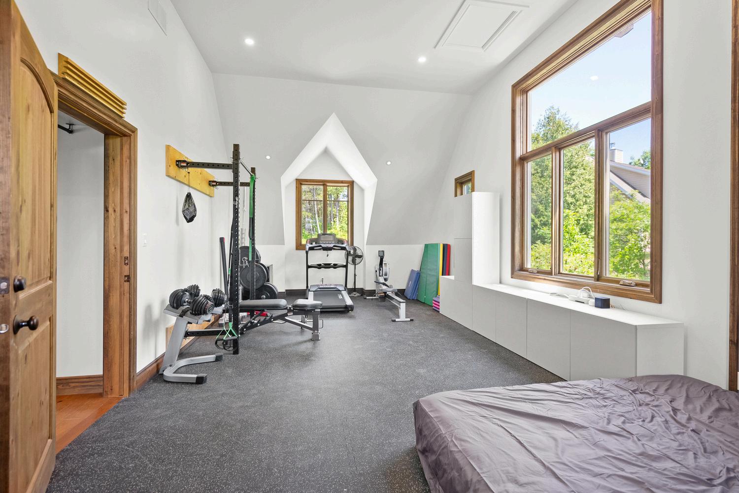 Luxurious Bedrooms and Baths: The main floor includes three bedrooms with ensuite baths, and outdoor access. The second floor features four additional bedrooms, two full baths, and a gym with a climbing wall.