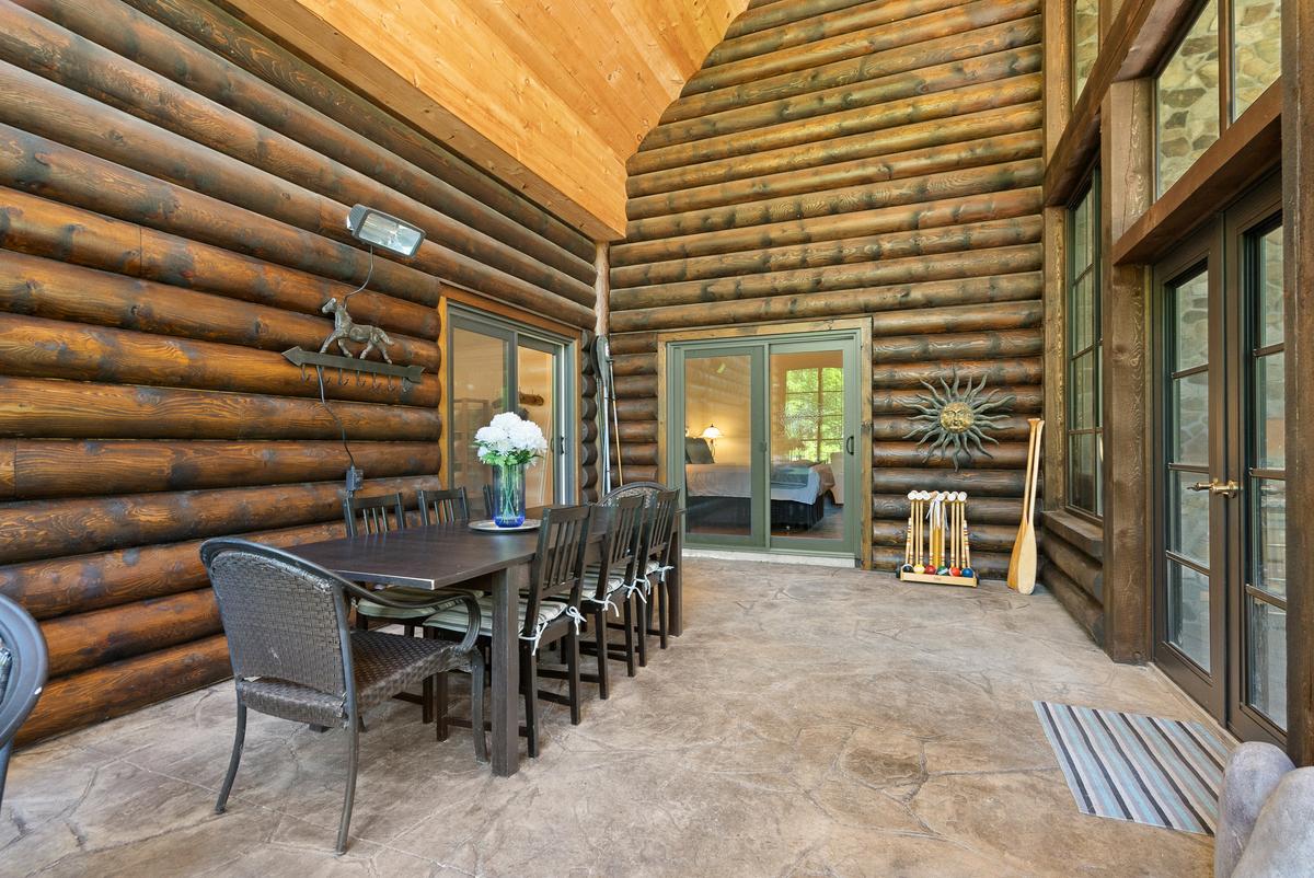 Outdoor Living: The sunroom and covered patio are perfect for entertaining, featuring stamped concrete, a wood-burning Chicago Brick pizza oven, stone walls, a built-in Napoleon BBQ, and soaring ceilings Relax in the hot tub or by the custom fire pit with granite seating.