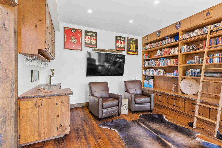 Impressive Construction: Built with post and beam construction from Northern Ontario pine trees, reclaimed 100-year-old flooring and a wide plank white pine ceilings Custom carpentry throughout Magnificent Great Room: With soaring 27 ft ceilings and custom windows, the great room is flooded with natural light. A stunning 27 ft high stone fireplace, made with stones from New Brunswick and mantels saved from an old barn, is the centrepiece.