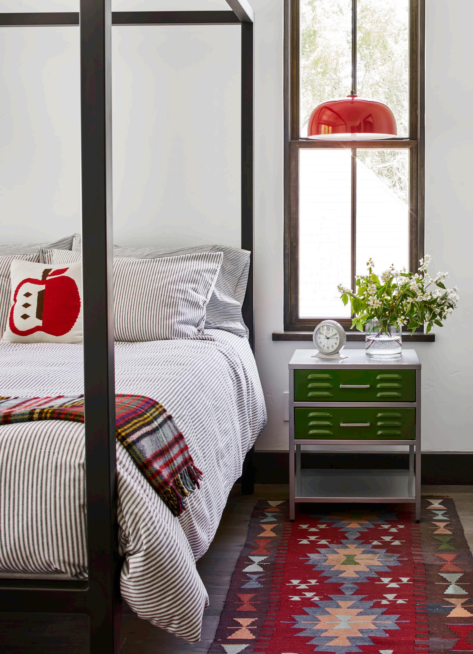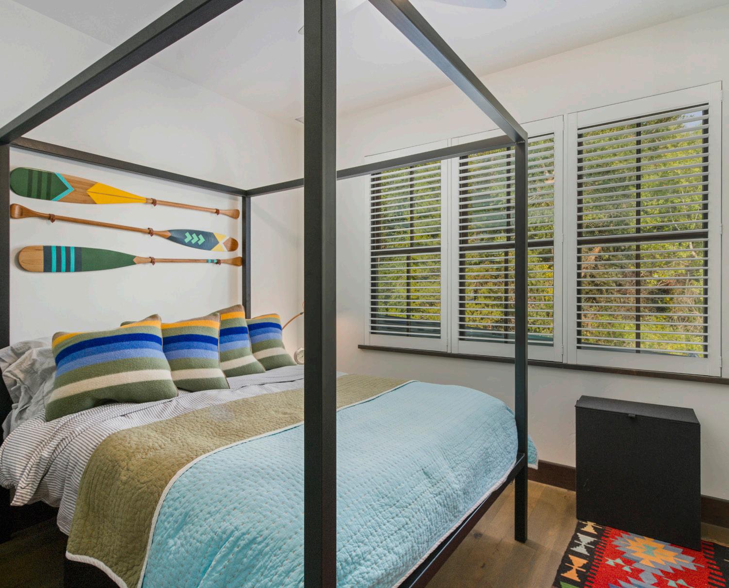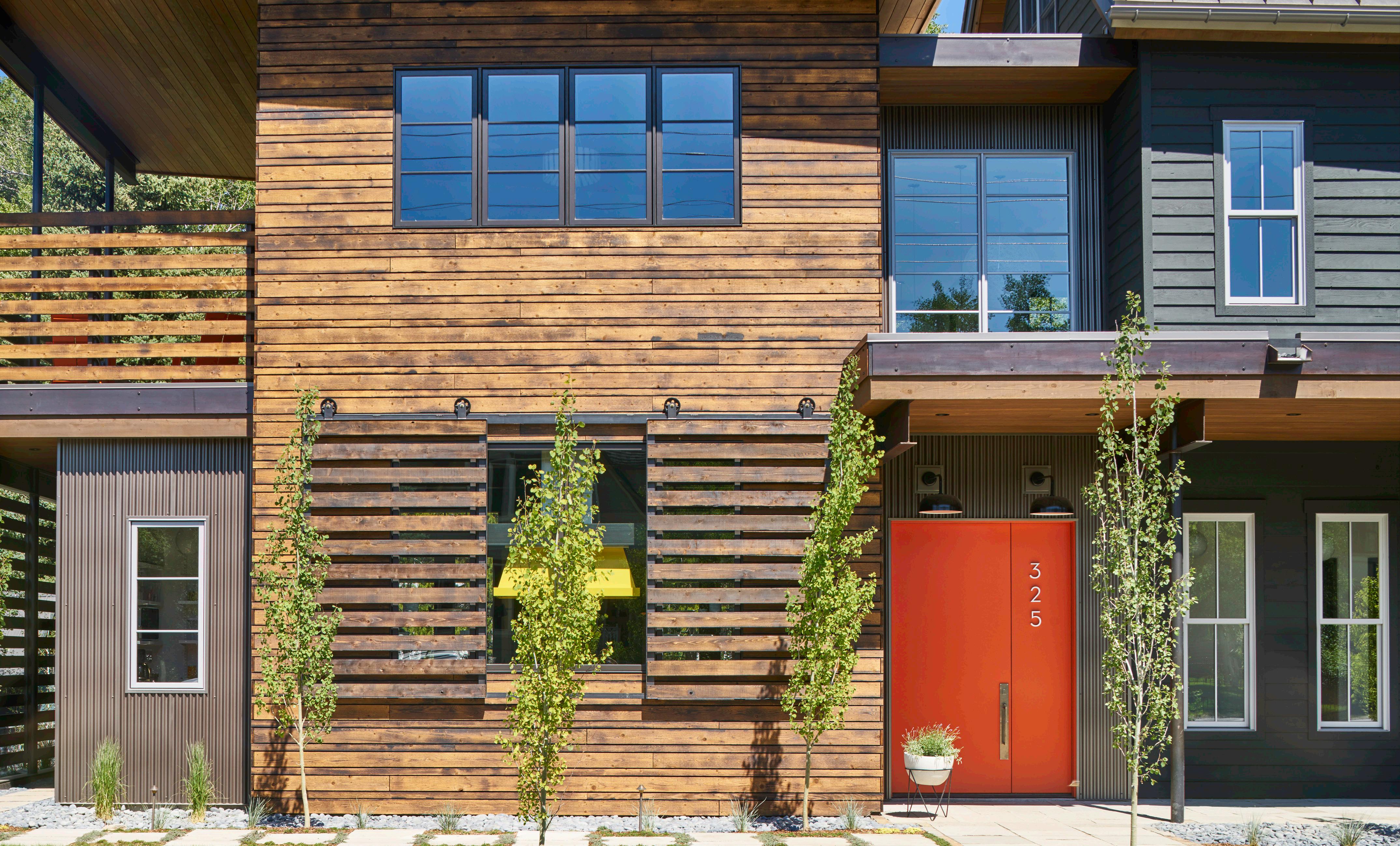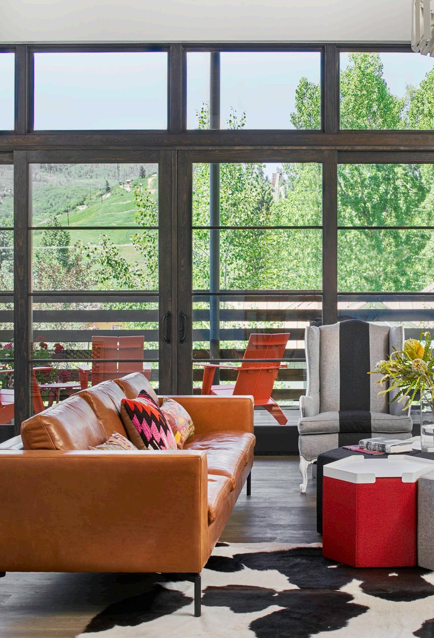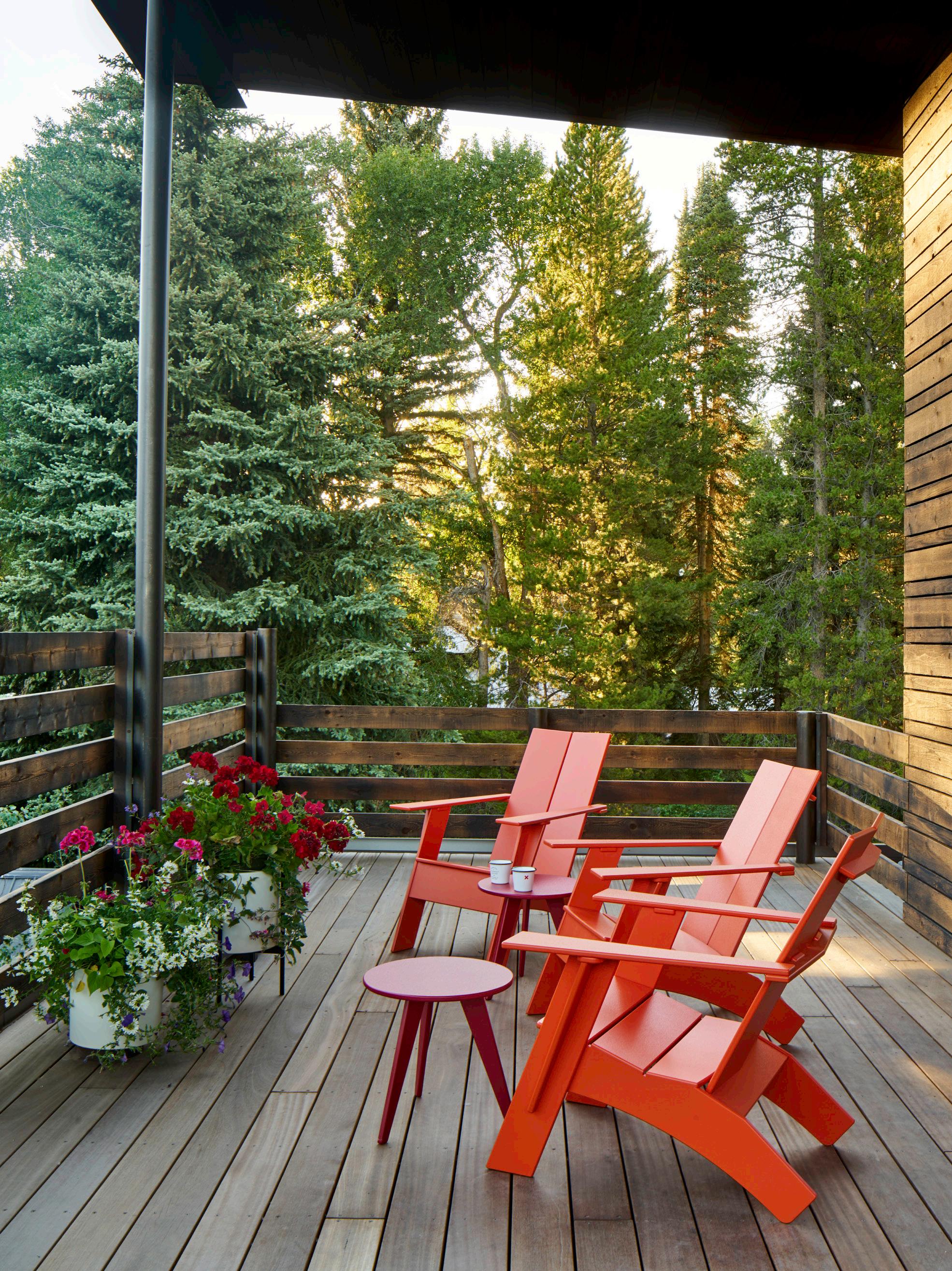 provides a pop of color accented by Neutra Modern house numbers. The front porch is furnished with cheerful red Adirondack-style rocking chairs so you can take in the downtown neighborhood scene with your morning coffee.