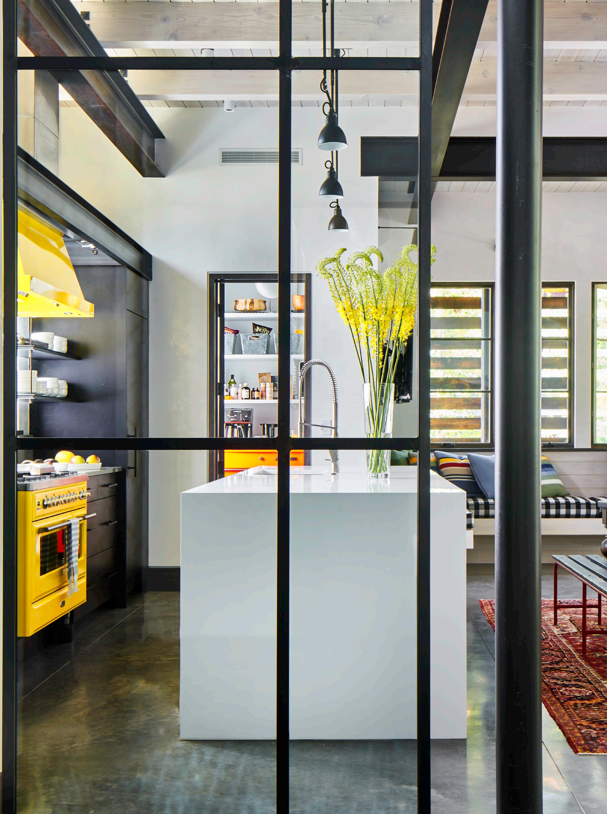 with no expense spared, features a bright yellow Italian range by Ilve and custom Vent A Hood. The raw steel open shelving keeps everything you need close at hand. There is a separate Subzero fridge and freezer, a Bosch dishwasher and a large walk-in pantry.