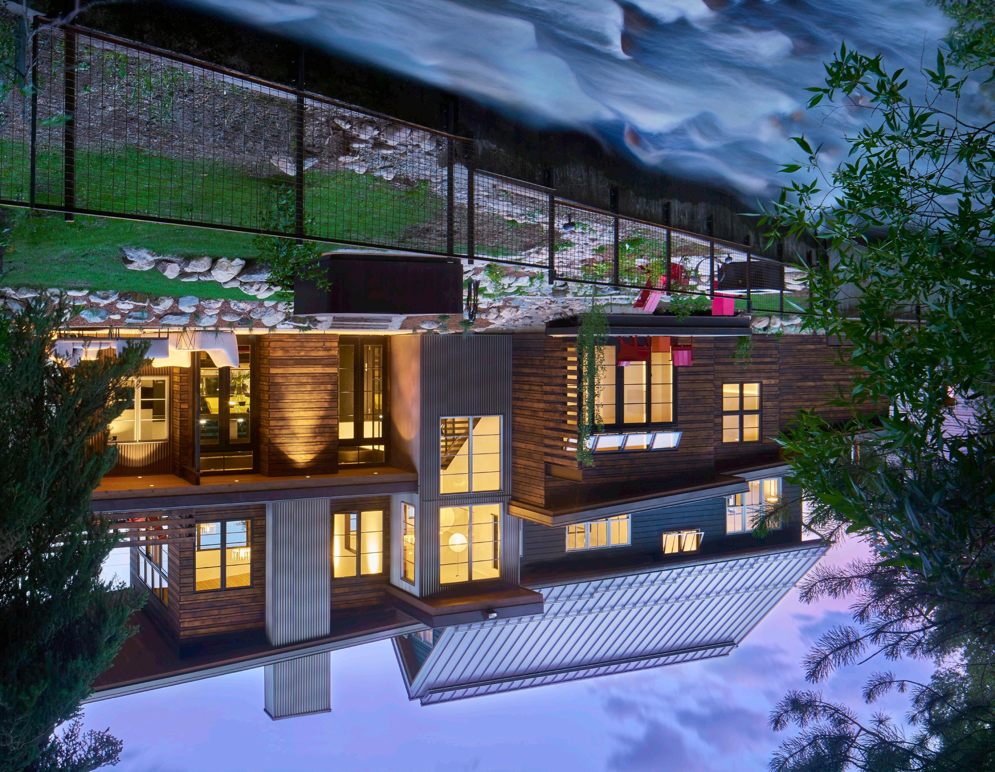 from the smooth concrete and wood floors creates a quiet interior allowing the soothing sounds of Soda Creek to take center stage.