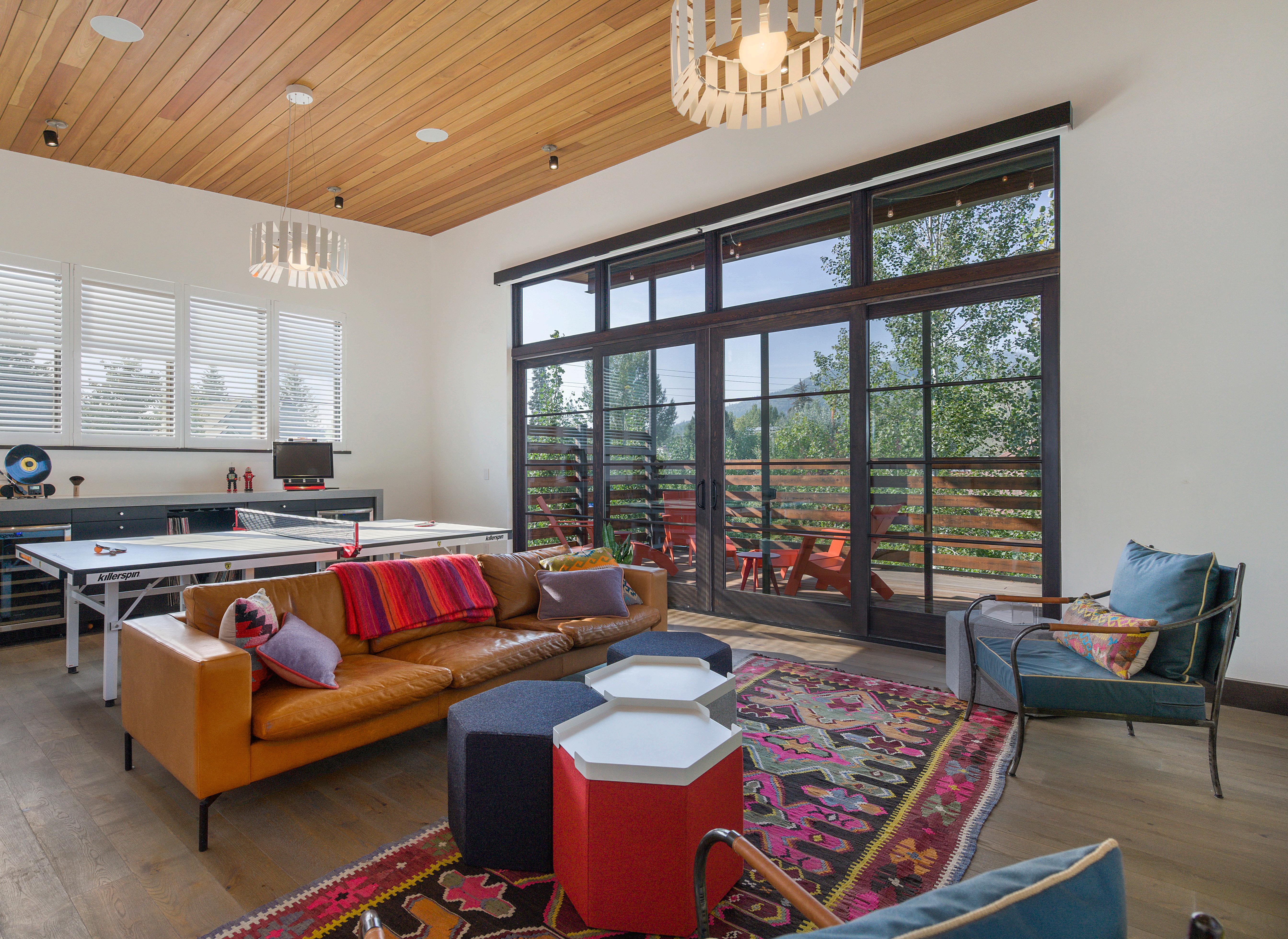 Entertainment Space for all in the upstairs rec room. The cozy additional living space is complete with an oversized tv, Ping-Pong table, and a bar counter with wine coolers.