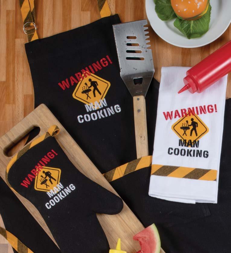 B. WARNING EMBROIDERED ENSEMBLE 26 in x 32 in chef apron with pocket 16 in x 26 in embr. dual purpose towel 13 in oven mitt
