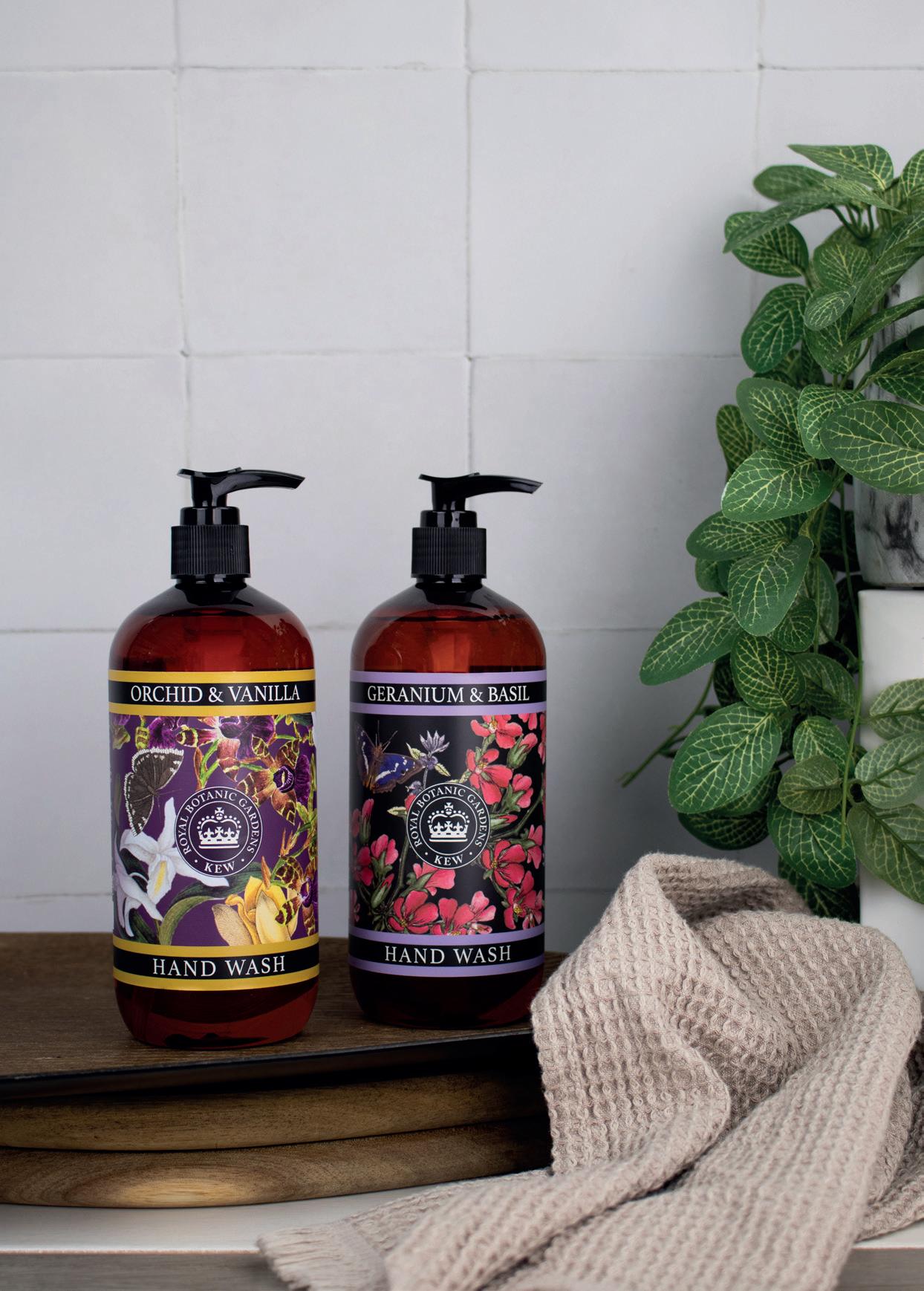 This luxurious hand wash collection draws inspiration from the fragrance and beauty of the plants at Kew Gardens. Available in 18 different scents to complement our popular soaps and hand creams, these hand washes are enriched with Aloe vera and vitamin E. Each wash is free from SLS and parabens, and comes in a bottle made from PCR recycled plastic, which is also fully recyclable.