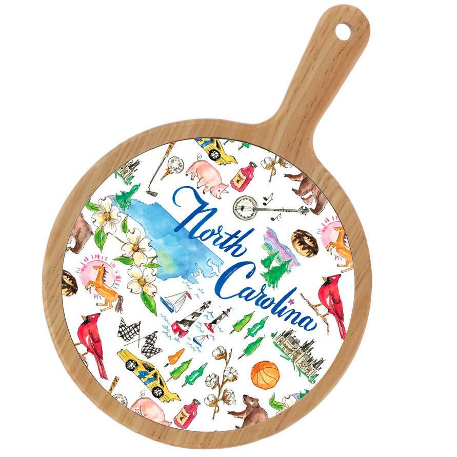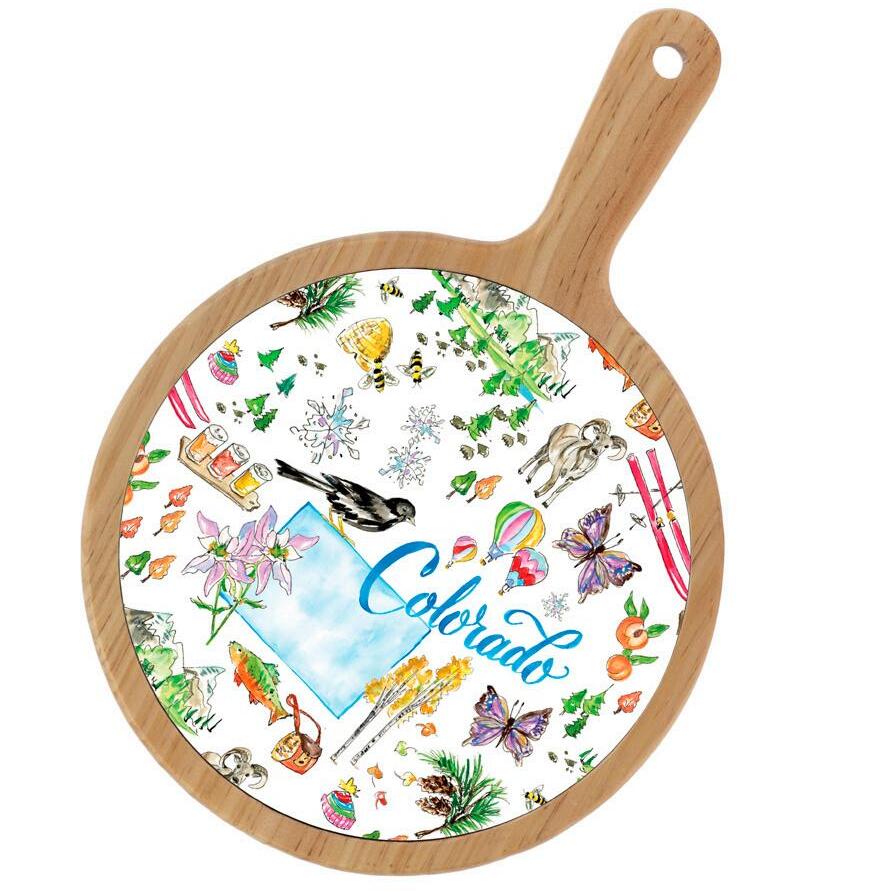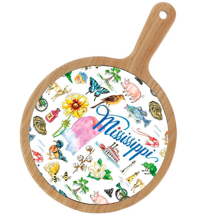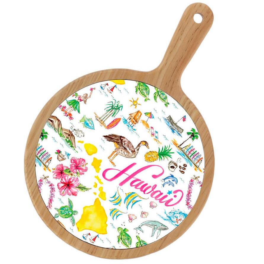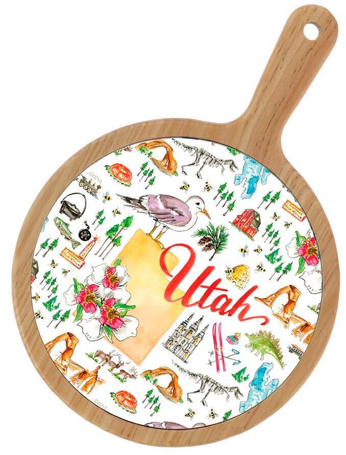 acacia wood & ceramic 12" L x 8.75" W x .25" H with handle sold in units of 4 / $7.50