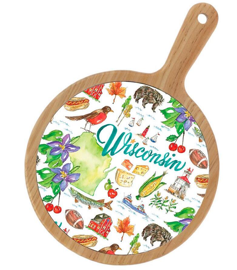 WI cheese board acacia wood & ceramic 12" L x 8.75" W x .25" H with handle sold in units of 4 / $7.50
