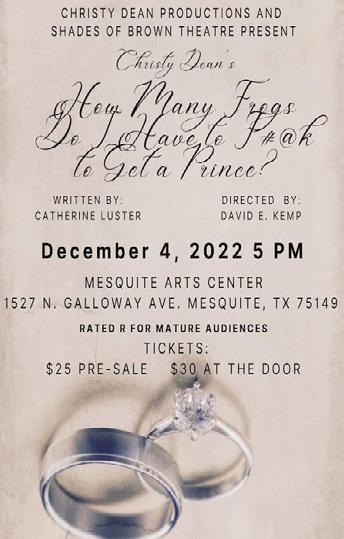 Do I Have to F#@K to Get a Prince at 5 pm at the Mesquite Arts Center, 1527 N. Galloway Ave. Mesquite. Tickets: www.shadesofbrownt heatre.ticketleap.com/How-Ma ny_Frogs 6