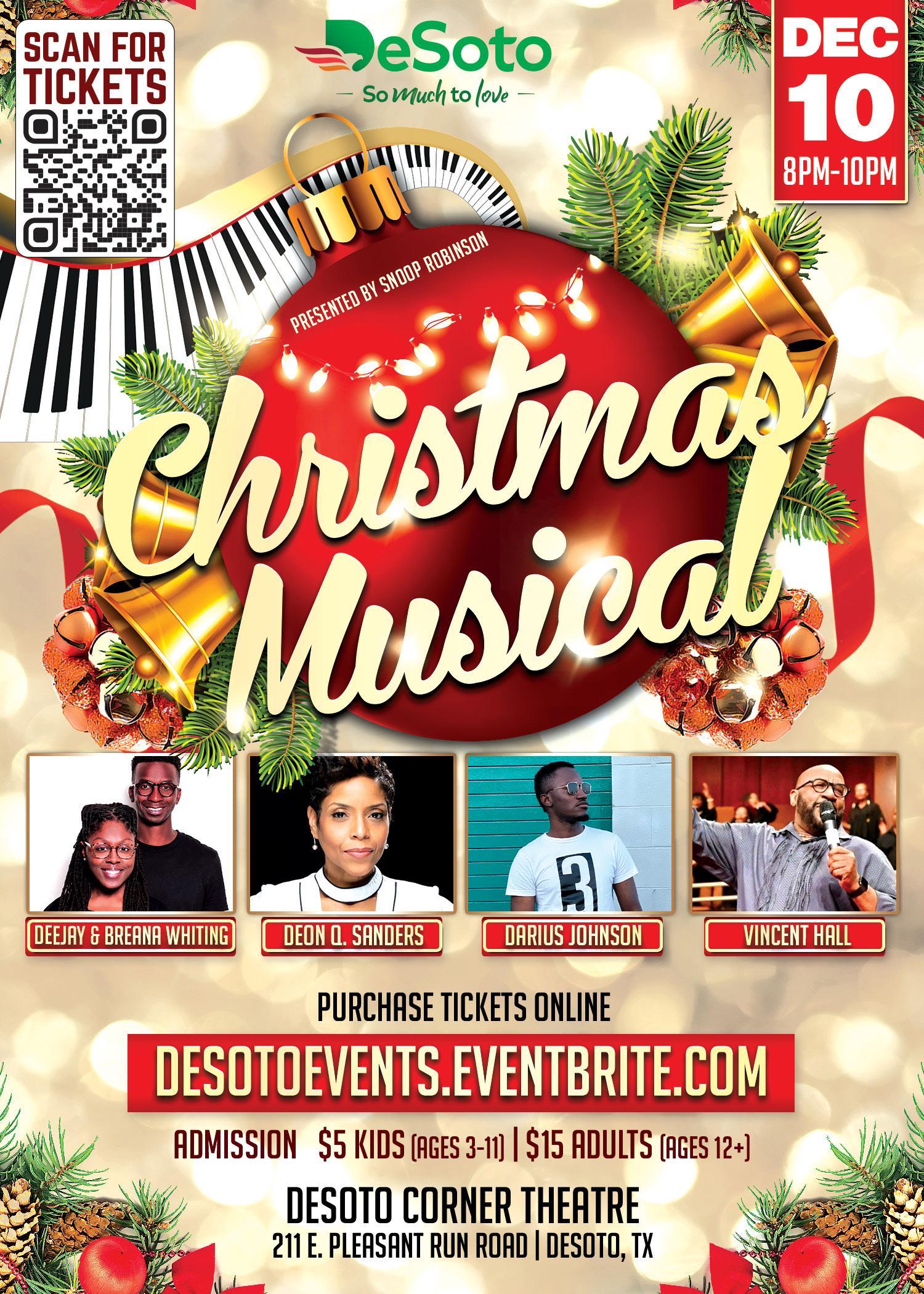 Christmas Musical by DeSoto Parks and Recreation Dept. from 8 to 10 pm. at DeSoto Corner Theater 211 E. Pleasant Run Rd. DeSoto. Tickets: http://bit.ly/3EM8GEE