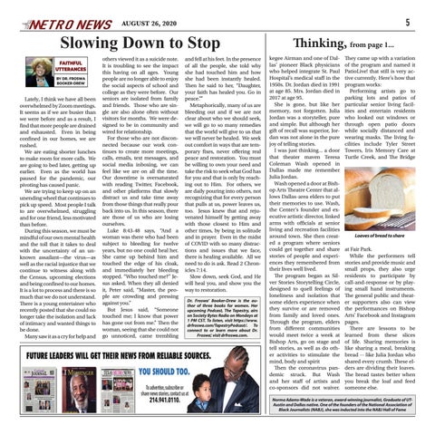 Thinking, from page 1... kegee Airman and one of Dallas’ pioneer Black physicians who helped integrate St. Paul Hospital’s medical staff in the 1950s. Dr. Jordan died in 1991 at age 85. Mrs. Jordan died in 2017 at age 95. She is gone, but like her memory, not forgotten. Julia Jordan was a storyteller, pure and simple. But although her gift of recall was superior, Jordan was not alone in the pure joy of telling stories. I was just thinking... a door that theater maven Teresa Coleman Wash opened in Dallas made me remember Julia Jordan. Wash opened a door at Bishop Arts Theatre Center that allows Dallas-area elders to put their memories to use. Wash, the Center’s founder and executive artistic director, linked arms with officials at senior living and recreation facilities around town. She then created a program where seniors could get together and share stories of people and experiences they remembered from their lives well lived. The program began as Silver Stories Storytelling Circle, designed to quell feelings of loneliness and isolation that some elders experience when they survive or are removed from family and loved ones. Through the program, elders from different communities would meet twice a week at Bishop Arts, go on stage and tell stories, as well as do other activities to stimulate the mind, body and spirit Then the coronavirus pandemic struck. But Wash and her staff of artists and co-sponsors did not waiver.