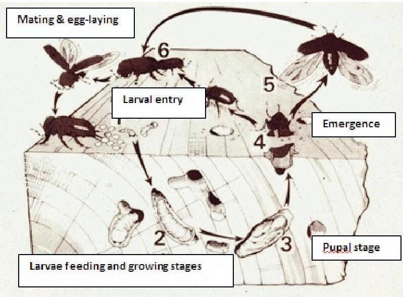 Bore dust (also known as frass): caused by emerging adult beetles, usually visible below the infested timber.