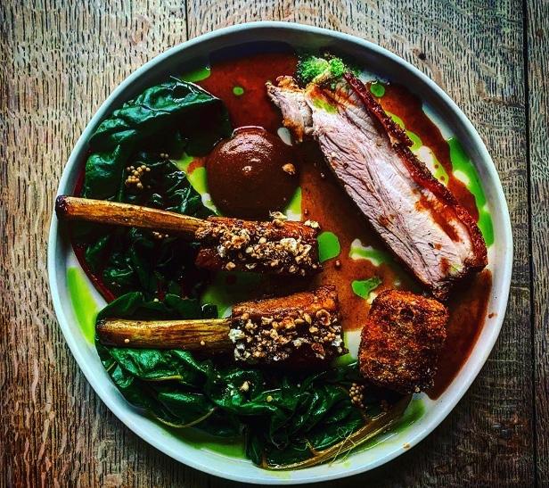 DINGLEY DELL PORK RECIPE with apple ketchup, sticky ribs, potato croquette and winter greens