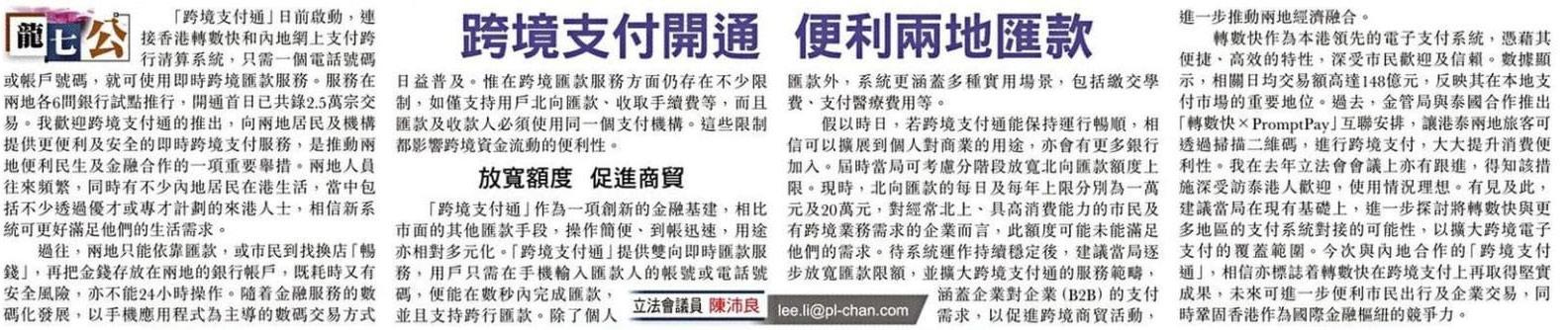 我接受信報採訪指出, 跨境養老服務會有一定 需求,惟目前本港能提 供到跨境養老保險服務 的保險公司不多,若有 跨境保險機構能在港提 供相關產品,對促進本 地保險市場發展會有好 處,亦可令消費者有更 多選擇。 2025 05.06