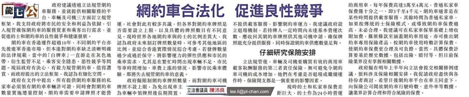 政府提出網約車規管框 架,網約私家車將來要 購買商用車第三者保險。 我指出考慮到部分網約 車司機只屬兼職,在現 有私家車第三者保險擴 展條款就可達到商用車 的保障。