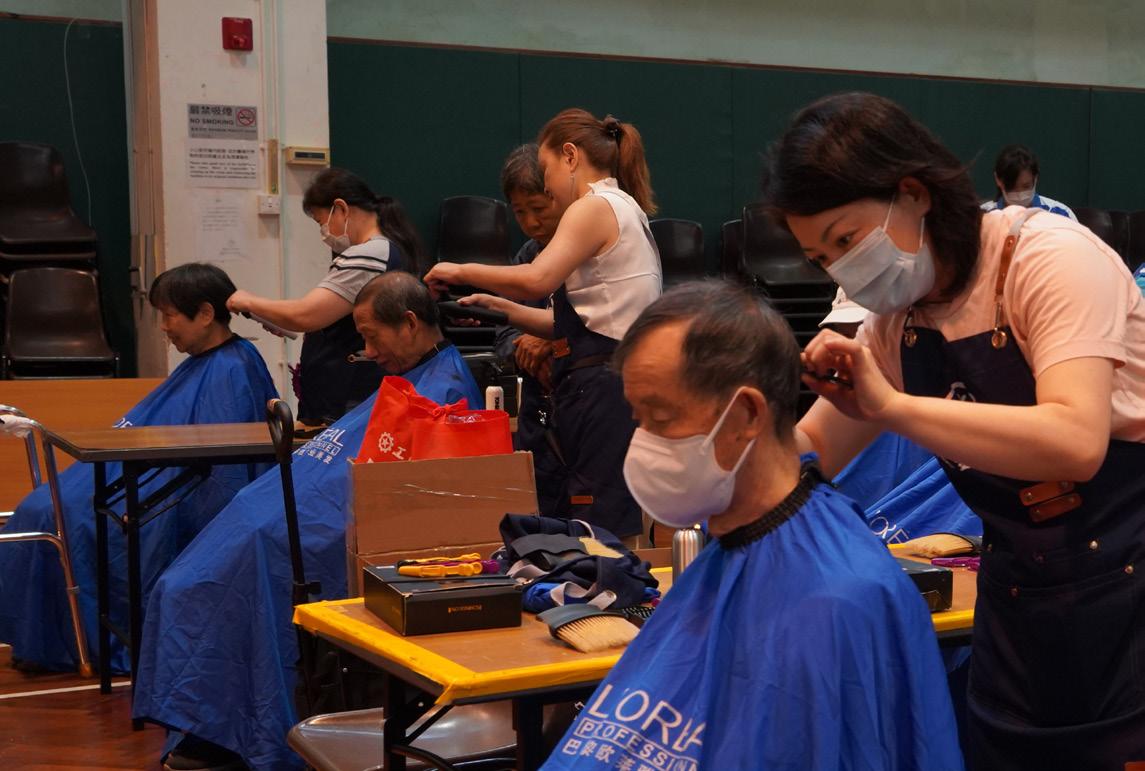 在藍田東社區會堂,為逾200名長者義務剪髮,亦有地區團體準備精彩節目演出。